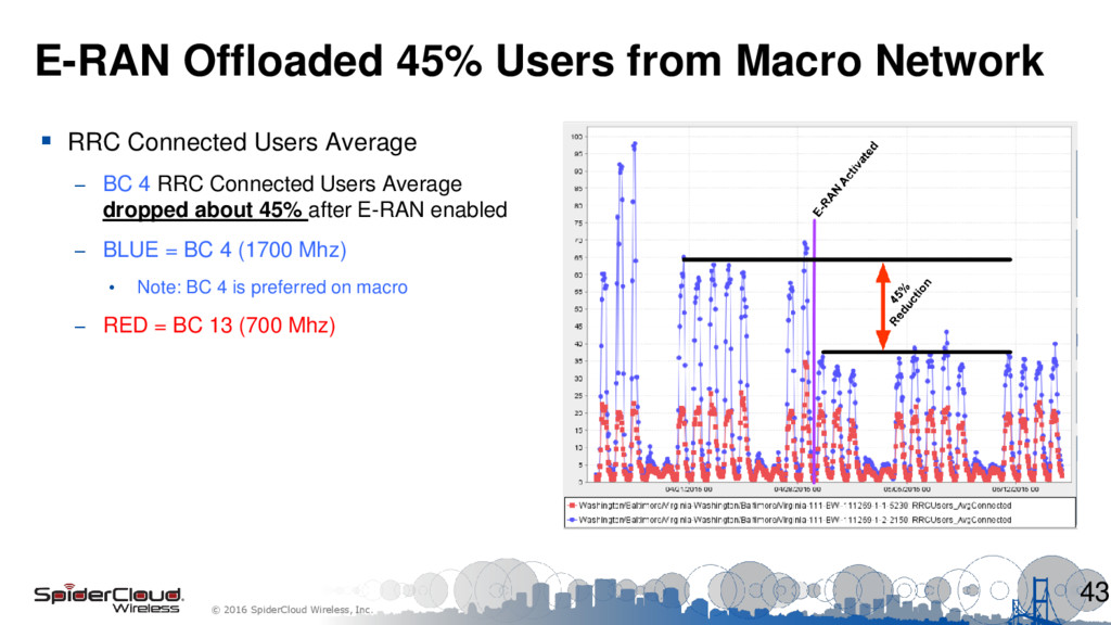 on Macro Downlink Throughput – BC 4 DL dropped about 16% after E-RAN enabled – BLUE = BC 4 (1700 Mhz) • Note: BC 4 is preferred on macro – RED = BC 13 (700 Mhz) Downlink Usage – RRC Connected Users dropped by 45% but DL Throughput dropped by only 16% – Conclusion: Less users consuming more bandwidth means better user experience 44