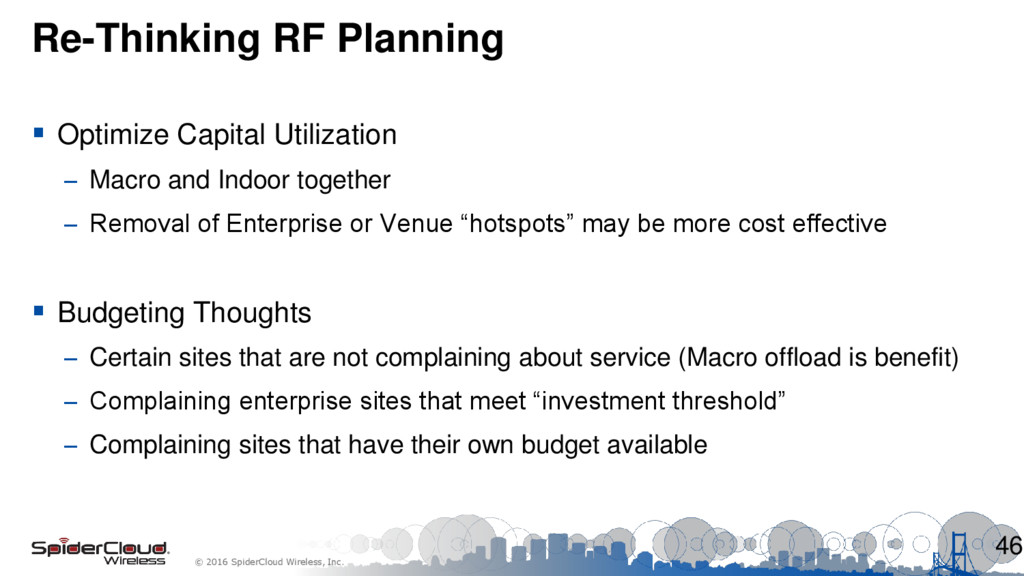 Capital Utilization – Macro and Indoor together – Removal of Enterprise or Venue “hotspots” may be more cost effective Budgeting Thoughts – Certain sites that are not complaining about service (Macro offload is benefit) – Complaining enterprise sites that meet “investment threshold” – Complaining sites that have their own budget available 46