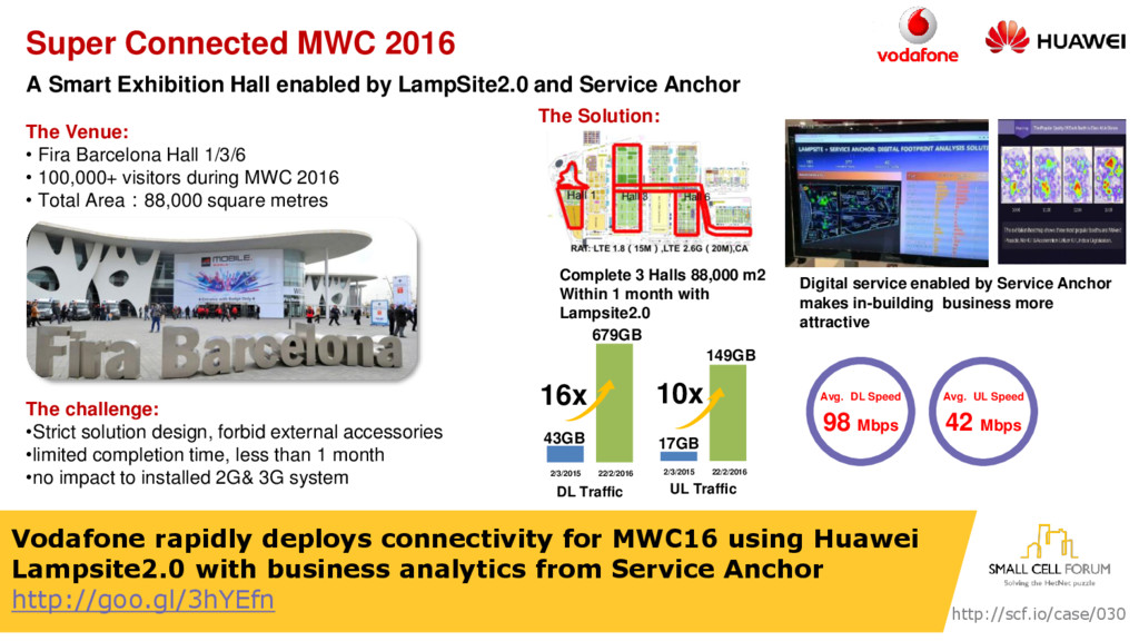 LampSite2.0 and Service Anchor Avg. DL Speed Avg. UL Speed 98 Mbps 42 Mbps The Venue: • Fira Barcelona Hall 1/3/6 • 100,000+ visitors during MWC 2016 • Total Area:88,000 square metres The challenge: •Strict solution design, forbid external accessories •limited completion time, less than 1 month •no impact to installed 2G& 3G system The Solution: DL Traffic 43GB 679GB 16x 22/2/2016 2/3/2015 UL Traffic 17GB 149GB 10x 22/2/2016 2/3/2015 Digital service enabled by Service Anchor makes in-building business more attractive Complete 3 Halls 88,000 m2 Within 1 month with Lampsite2.0 Vodafone rapidly deploys connectivity for MWC16 using Huawei Lampsite2.0 with business analytics from Service Anchor http://goo.gl/3hYEfn http://scf.io/case/030