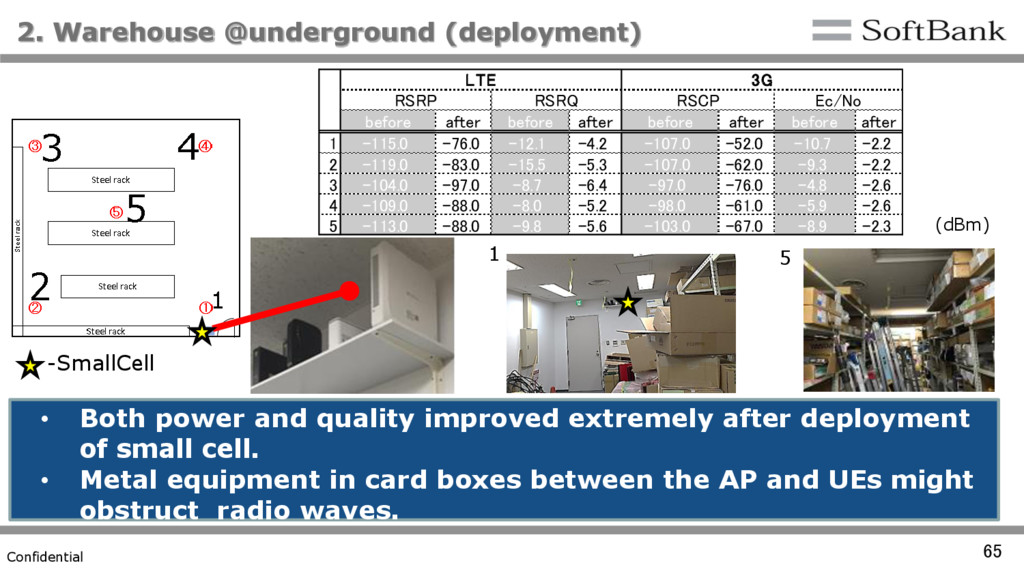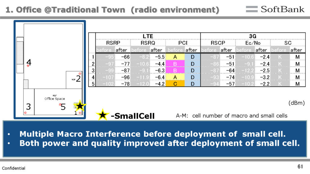 quality improved extremely after deployment of small cell. • Metal equipment in card boxes between the AP and UEs might obstruct radio waves. 5 1 -SmallCell (dBm) before after before after before after before after 1 -115.0 -76.0 -12.1 -4.2 -107.0 -52.0 -10.7 -2.2 2 -119.0 -83.0 -15.5 -5.3 -107.0 -62.0 -9.3 -2.2 3 -104.0 -97.0 -8.7 -6.4 -97.0 -76.0 -4.8 -2.6 4 -109.0 -88.0 -8.0 -5.2 -98.0 -61.0 -5.9 -2.6 5 -113.0 -88.0 -9.8 -5.6 -103.0 -67.0 -8.9 -2.3 LTE 3G RSRP RSRQ RSCP Ec/No