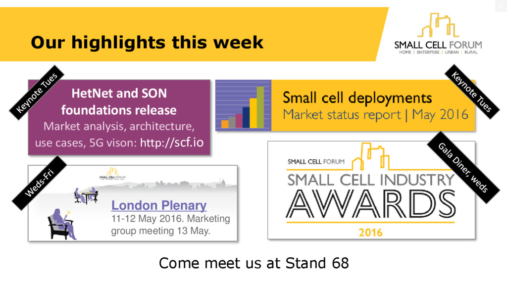week HetNet and SON foundations release Market analysis, architecture, use cases, 5G vison: http://scf.io London Plenary 11-12 May 2016. Marketing group meeting 13 May.