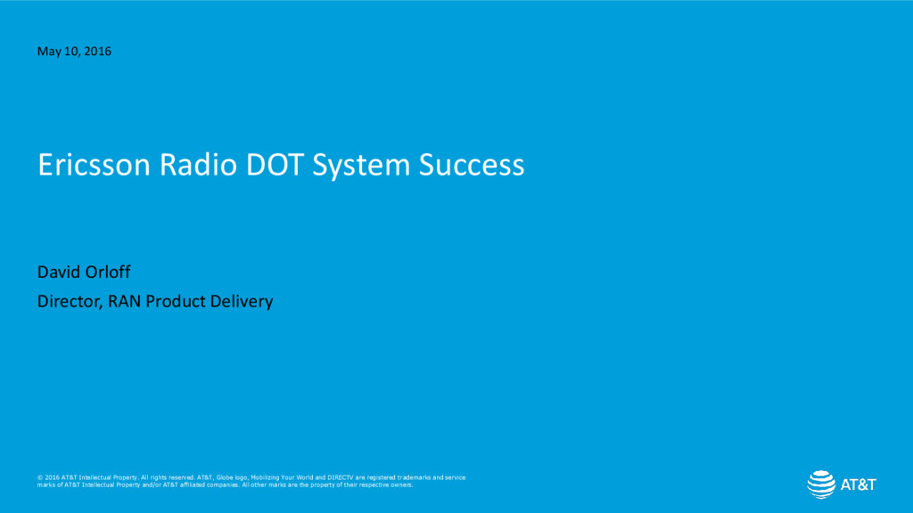 logo, Mobilizing Your World and DIRECTV are registered trademarks and service marks of AT&T Intellectual Property and/or AT&T affiliated companies. All other marks are the property of their respective owners. Ericsson Radio DOT System Success David Orloff Director, RAN Product Delivery May 10, 2016