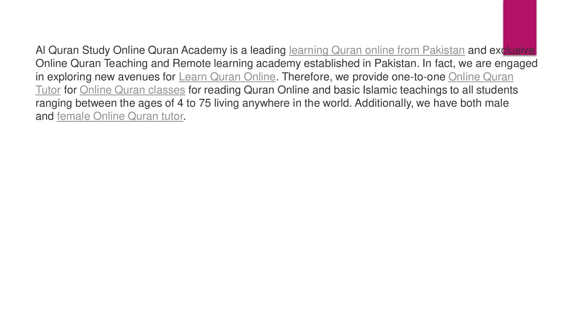 Al Quran Study Online Quran Academy is a leading learning Quran online from Pakistan and exclusive Online Quran Teaching and Remote learning academy established in Pakistan.