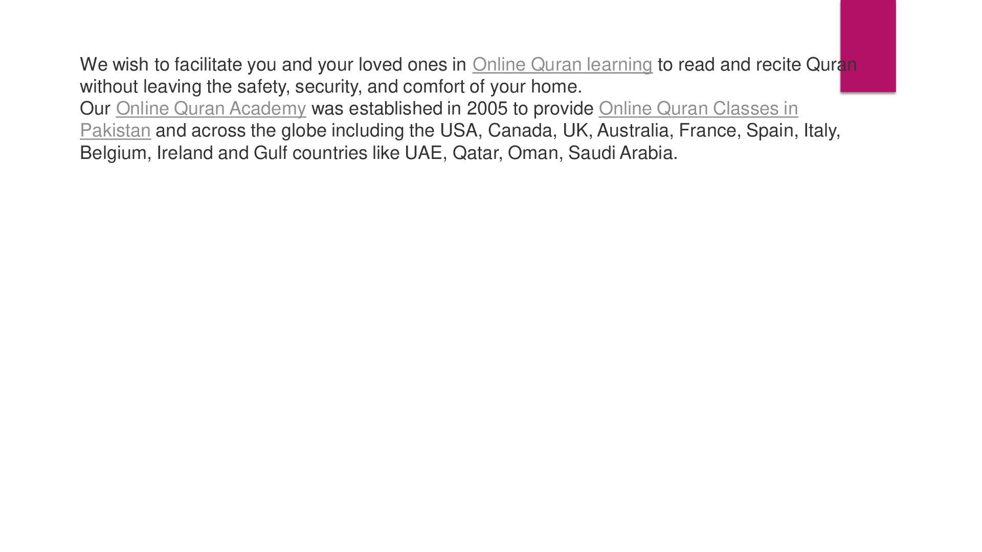 Online Quran learning to read and recite Quran without leaving the safety, security, and comfort of your home. Our Online Quran Academy was established in 2005 to provide Online Quran Classes in Pakistan and across the globe including the USA, Canada, UK, Australia, France, Spain, Italy, Belgium, Ireland and Gulf countries like UAE, Qatar, Oman, Saudi Arabia.