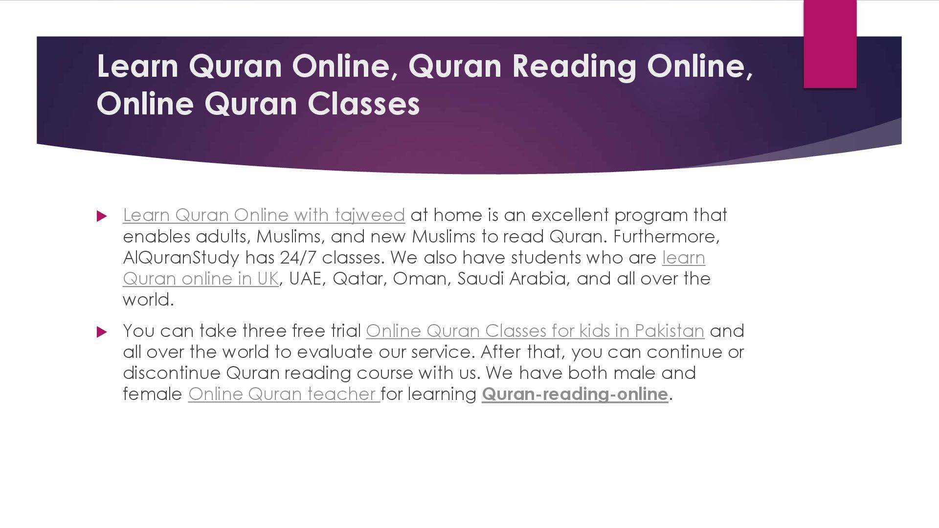 Learn Quran Online with tajweed at home is an excellent program that enables adults, Muslims, and new Muslims to read Quran. Furthermore, AlQuranStudy has 24/7 classes. We also have students who are learn Quran online in UK, UAE, Qatar, Oman, Saudi Arabia, and all over the world. You can take three free trial Online Quran Classes for kids in Pakistan and all over the world to evaluate our service. After that, you can continue or discontinue Quran reading course with us. We have both male and female Online Quran teacher for learning Quran-reading-online.