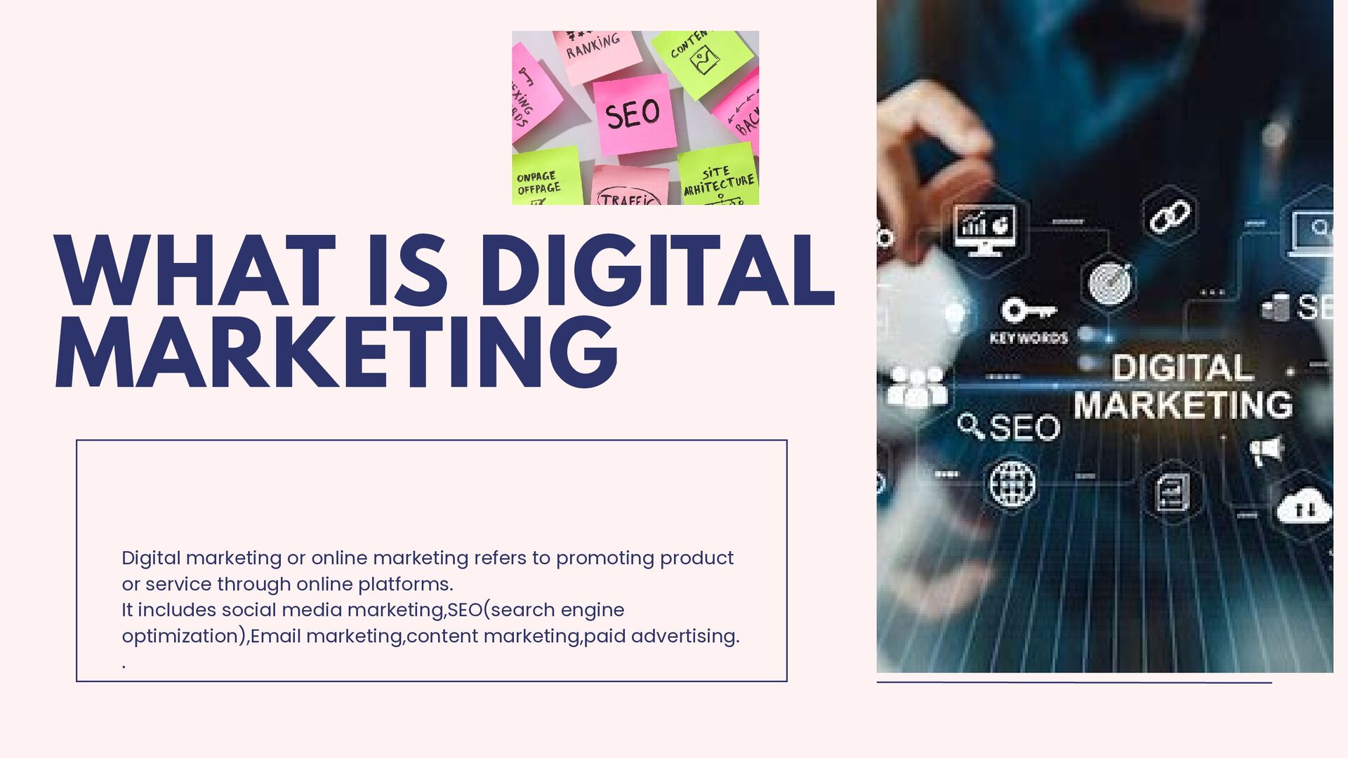 to promoting product or service through online platforms. It includes social media marketing,SEO(search engine optimization),Email marketing,content marketing,paid advertising. .