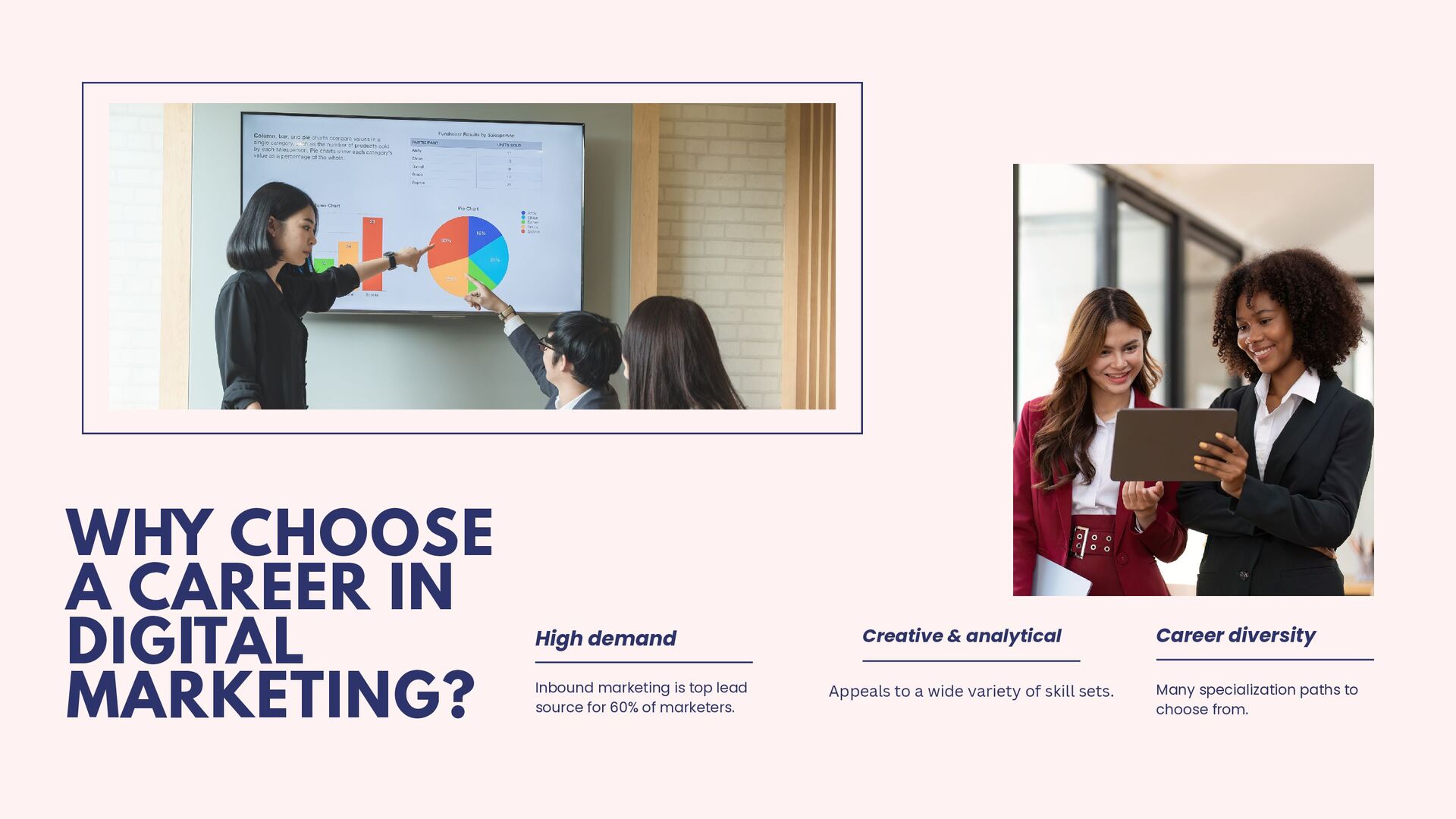top lead source for 60% of marketers. High demand Creative & analytical Many specialization paths to choose from. Career diversity Appeals to a wide variety of skill sets.