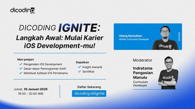 Dicoding Ignite: Path to iOS Engineering adalah acara spesial bagi siapa saja yang ingin belajar pengembangan aplikasi iOS di Dicoding. Dengan pendekatan yang ramah untuk pemula, peserta akan belajar dasar-dasar pemrograman Swift dan membangun aplikasi sederhana. Tidak diperlukan pengalaman coding sebelumnya—cukup antusiasme untuk belajar!