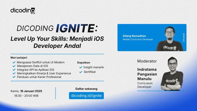 Dicoding Ignite: Path to iOS Engineering adalah acara spesial bagi para pembeli kelas satuan iOS di Dicoding. Event ini bertujuan untuk membantu iOS Developer yang sudah memiliki dasar pengetahuan untuk naik ke level berikutnya. Fokus utama adalah membangun aplikasi dengan SwiftUI, memahami manajemen data, dan menggunakan API. Peserta akan mendapatkan tips dan trik untuk meningkatkan kualitas aplikasi yang mereka buat.