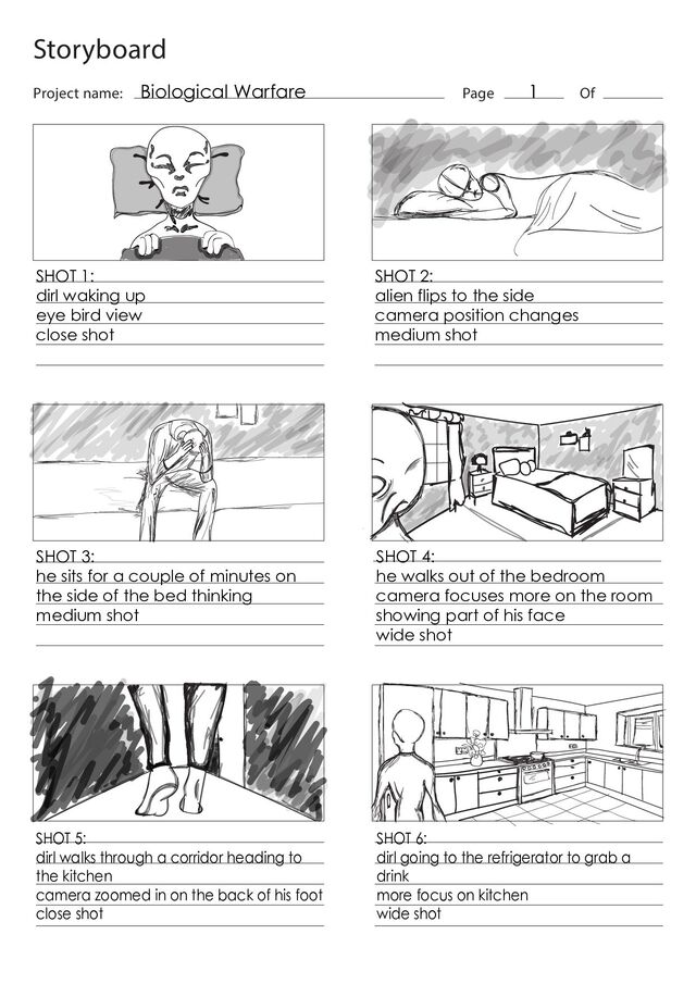 dirl waking up eye bird view close shot SHOT 2: alien flips to the side camera position changes medium shot SHOT 3: he sits for a couple of minutes on the side of the bed thinking medium shot SHOT 4: he walks out of the bedroom camera focuses more on the room showing part of his face wide shot SHOT 5: dirl walks through a corridor heading to the kitchen camera zoomed in on the back of his foot close shot SHOT 6: dirl going to the refrigerator to grab a drink more focus on kitchen wide shot