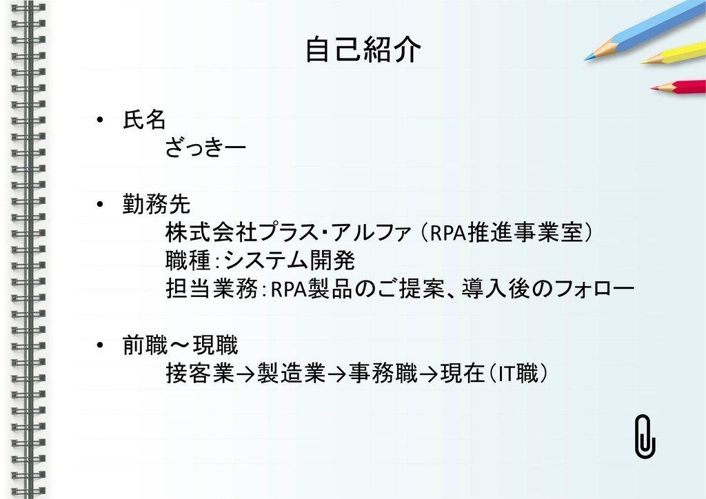 自己紹介 • 氏名 ざっきー • 勤務先 株式会社プラス・アルファ (RPA推進事業室) 職種:システム開発 担当業務:RPA製品のご提案、導入後のフォロー