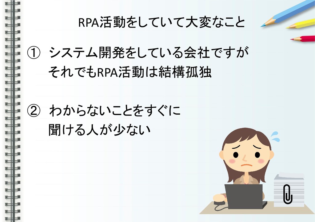 RPA活動をしていて大変なこと ① システム開発をしている会社ですが それでもRPA活動は結構孤独 ② わからないことをすぐに 聞ける人が少ない