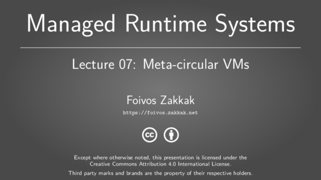 for Java written in Java Modular design (GC, Compilers, Memory layout, Monitors, etc.) Template based compilation More next time! Managed Runtime Systems 9 of 9 https://foivos.zakkak.net