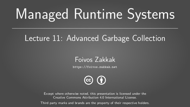 Bacon, Perry Cheng, and David Grove Y X Z a ROOTS Y X a ROOTS b Z Y X ROOTS b Z Y X ROOTS b Z MUT GC Y X ROOTS b GC MUT D4: Collector incorrectly frees object Z D1: Mutator stores pointer b into scanned object Y D2: Mutator removes pointer a from unscanned object X D3: Collector scans object X Fig. 3. Erroneous collection of live object Z via deletion of direct pointer a from object X. Object Allocation Besides pointer assignments, the mutator can also add objects to the connectivity graph. Similarly to pointer assignments, the allocation interacts with Figure Source: https://link.springer.com/chapter/10.1007%2F11531142_25 Managed Runtime Systems 14 of 20 https://foivos.zakkak.net