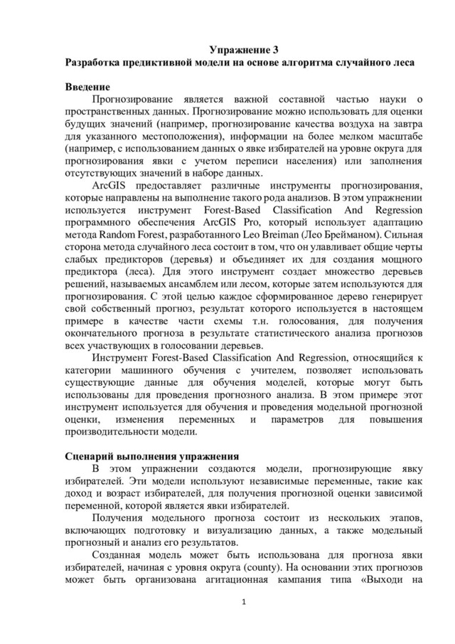 леса Введение Прогнозирование является важной составной частью науки о пространственных данных. Прогнозирование можно использовать для оценки будущих значений (например, прогнозирование качества воздуха на завтра для указанного местоположения), информации на более мелком масштабе (например, с использованием данных о явке избирателей на уровне округа для прогнозирования явки с учетом переписи населения) или заполнения отсутствующих значений в наборе данных. ArcGIS предоставляет различные инструменты прогнозирования, которые направлены на выполнение такого рода анализов. В этом упражнении используется инструмент Forest-Based Classification And Regression программного обеспечения ArcGIS Pro, который использует адаптацию метода Random Forest, разработанного Leo Breiman (Лео Брейманом). Сильная сторона метода случайного леса состоит в том, что он улавливает общие черты слабых предикторов (деревья) и объединяет их для создания мощного предиктора (леса). Для этого инструмент создает множество деревьев решений, называемых ансамблем или лесом, которые затем используются для прогнозирования. С этой целью каждое сформированное дерево генерирует свой собственный прогноз, результат которого используется в настоящем примере в качестве части схемы т.н. голосования, для получения окончательного прогноза в результате статистического анализа прогнозов всех участвующих в голосовании деревьев. Инструмент Forest-Based Classification And Regression, относящийся к категории машинного обучения с учителем, позволяет использовать существующие данные для обучения моделей, которые могут быть использованы для проведения прогнозного анализа. В этом примере этот инструмент используется для обучения и проведения модельной прогнозной оценки, изменения переменных и параметров для повышения производительности модели. Сценарий выполнения упражнения В этом упражнении создаются модели, прогнозирующие явку избирателей. Эти модели используют независимые переменные, такие как доход и возраст избирателей, для получения прогнозной оценки зависимой переменной, которой является явки избирателей. Получения модельного прогноза состоит из нескольких этапов, включающих подготовку и визуализацию данных, а также модельный прогнозный и анализ его результатов. Созданная модель может быть использована для прогноза явки избирателей, начиная с уровня округа (county). На основании этих прогнозов может быть организована агитационная кампания типа «Выходи на