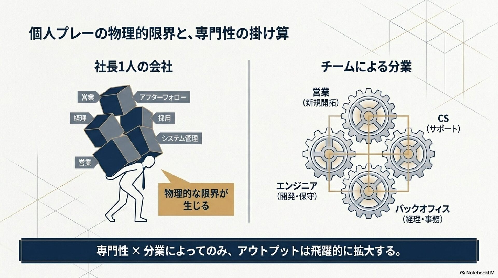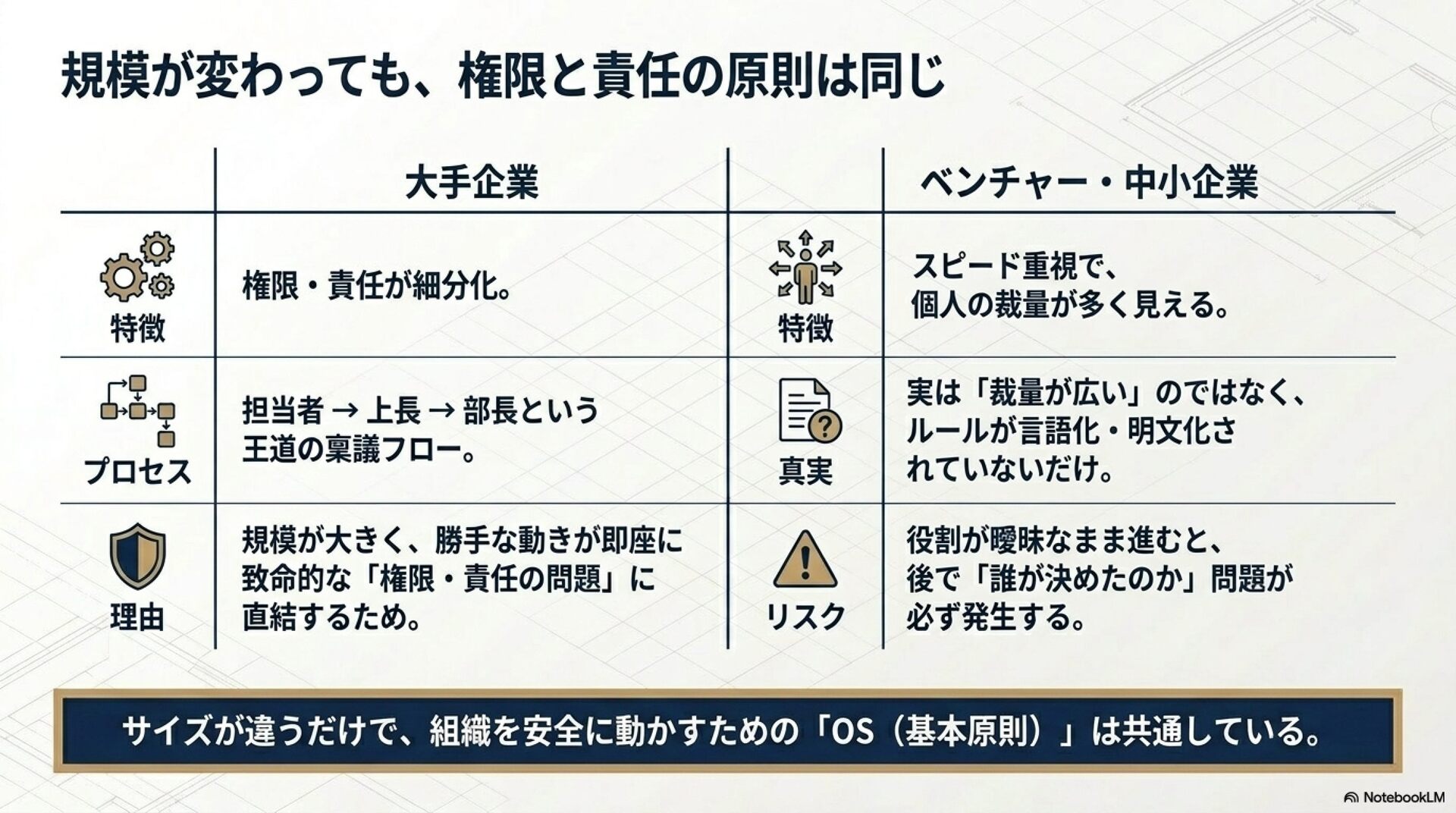 権限と責任の細分化度合いの違いがあるだけで、本質的には求められるアウトプットは変わらない印象です。