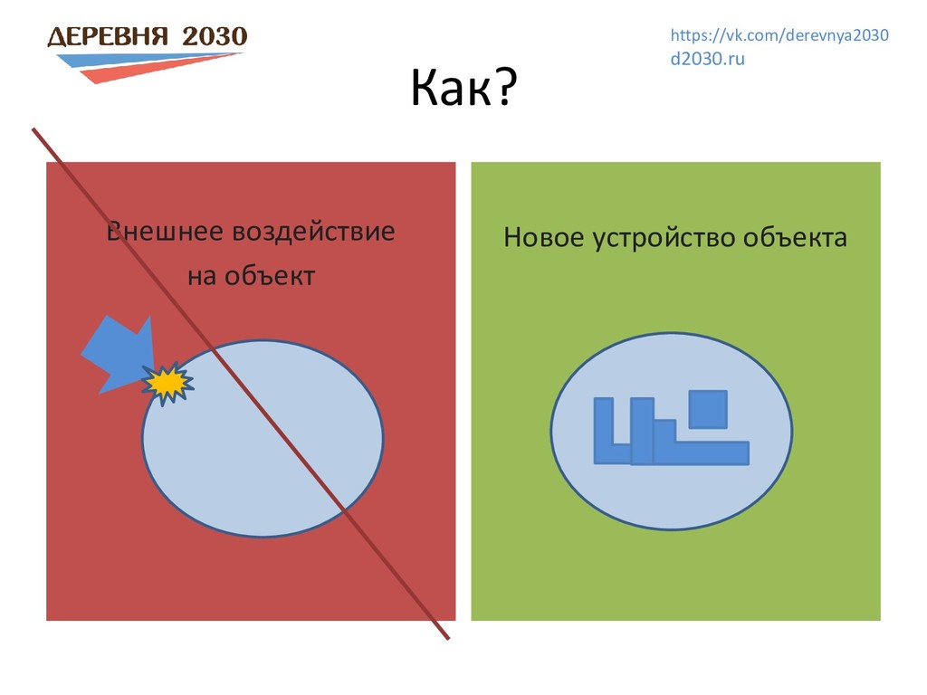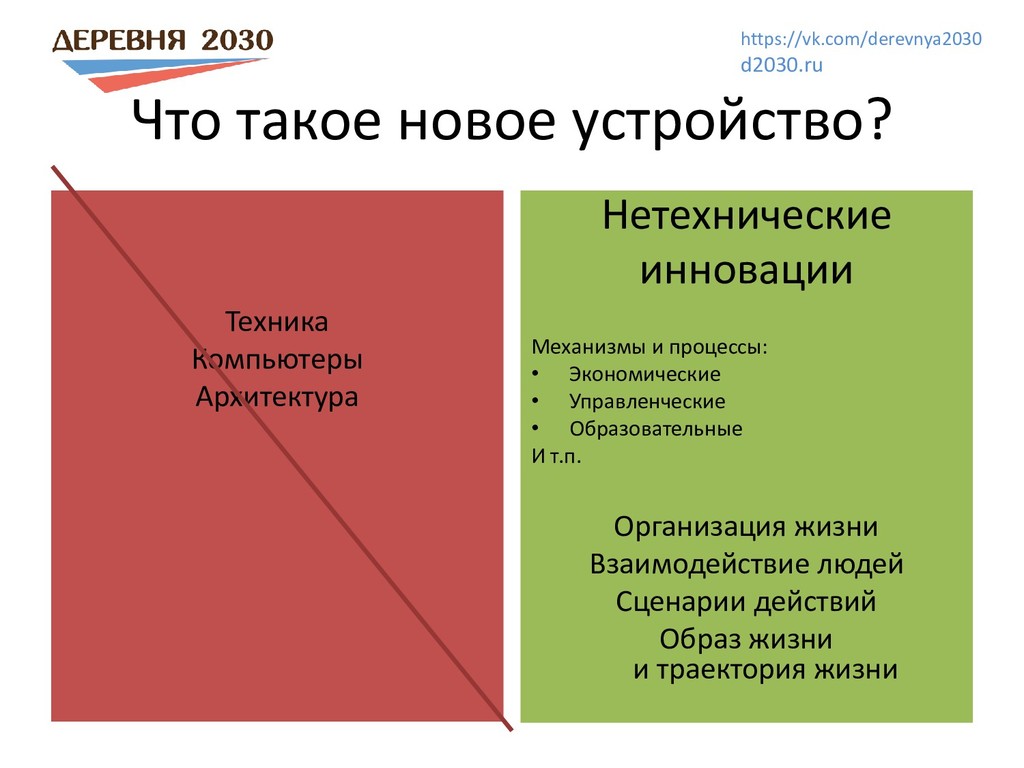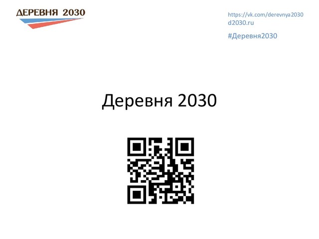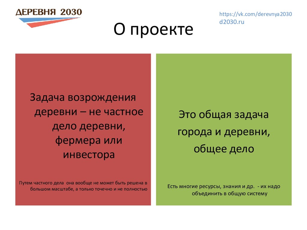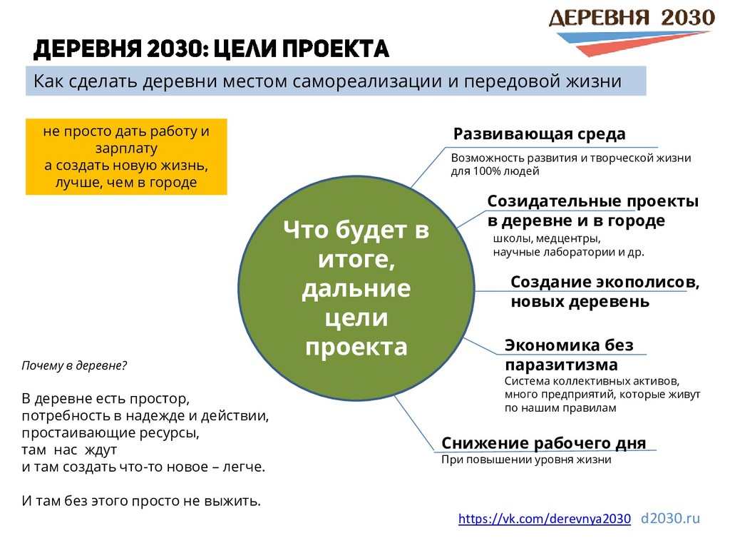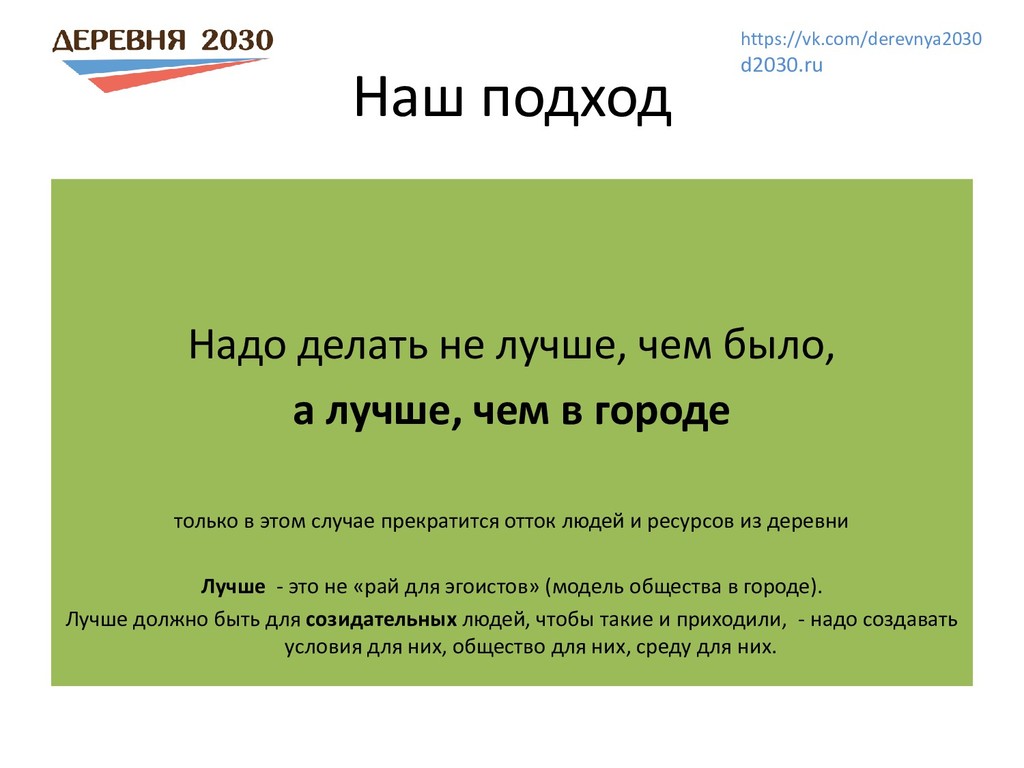 местом самореализации и передовой жизни Развивающая среда не просто дать работу и зарплату а создать новую жизнь, лучше, чем в городе Созидательные проекты в деревне и в городе Экономика без паразитизма Система коллективных активов, много предприятий, которые живут по нашим правилам Снижение рабочего дня При повышении уровня жизни Возможность развития и творческой жизни для 100% людей Почему в деревне? В деревне есть простор, потребность в надежде и действии, простаивающие ресурсы, там нас ждут и там создать что-то новое – легче. И там без этого просто не выжить. Создание экополисов, новых деревень школы, медцентры, научные лаборатории и др. https://vk.com/derevnya2030 d2030.ru