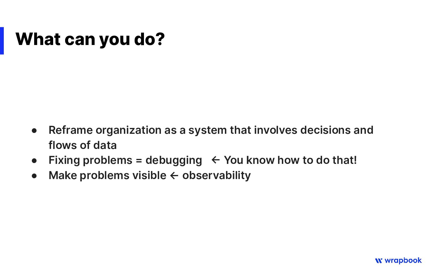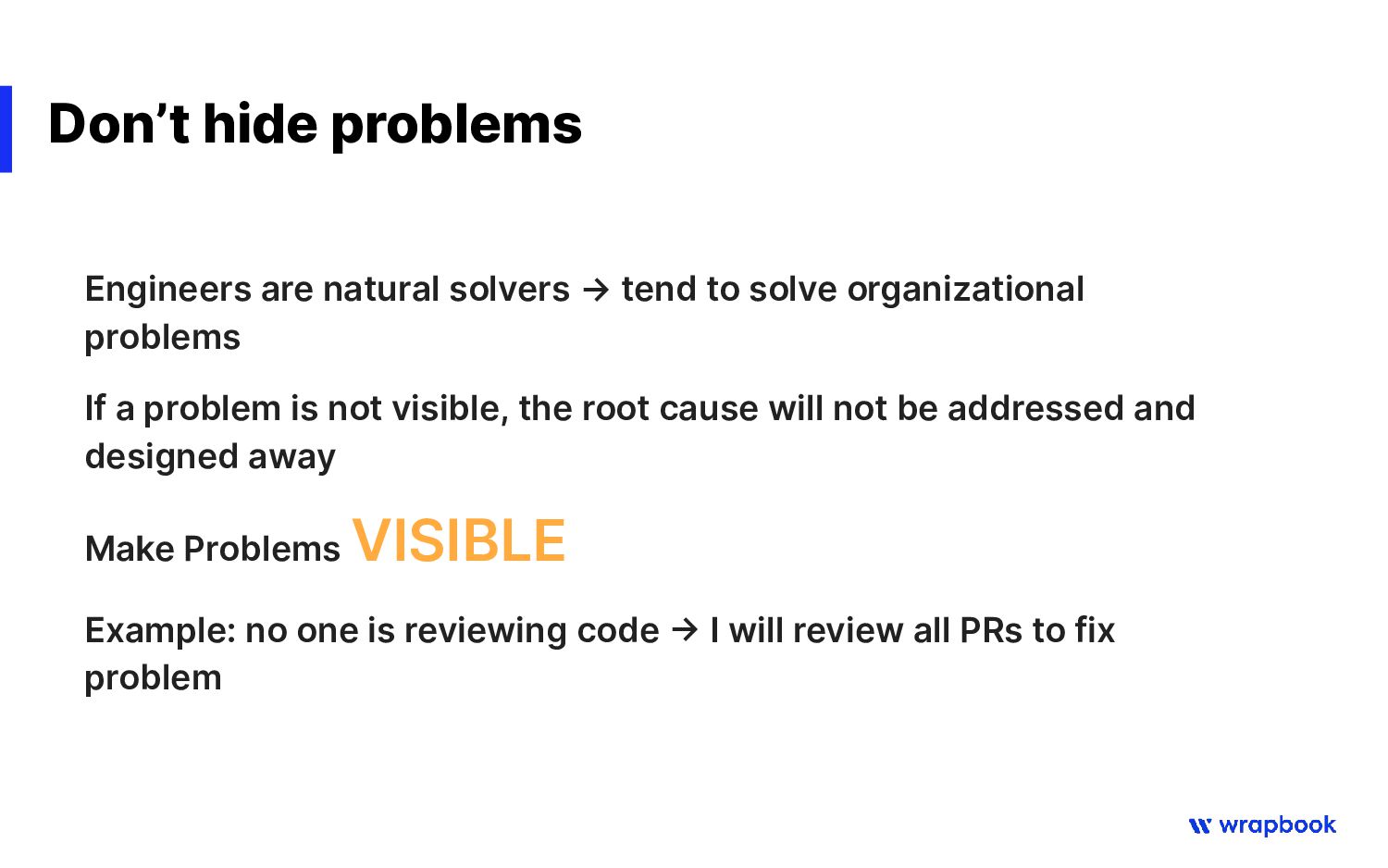 solve organizational problems If a problem is not visible, the root cause will not be addressed and designed away Make Problems VISIBLE Example: no one is reviewing code -> I will review all PRs to fix problem