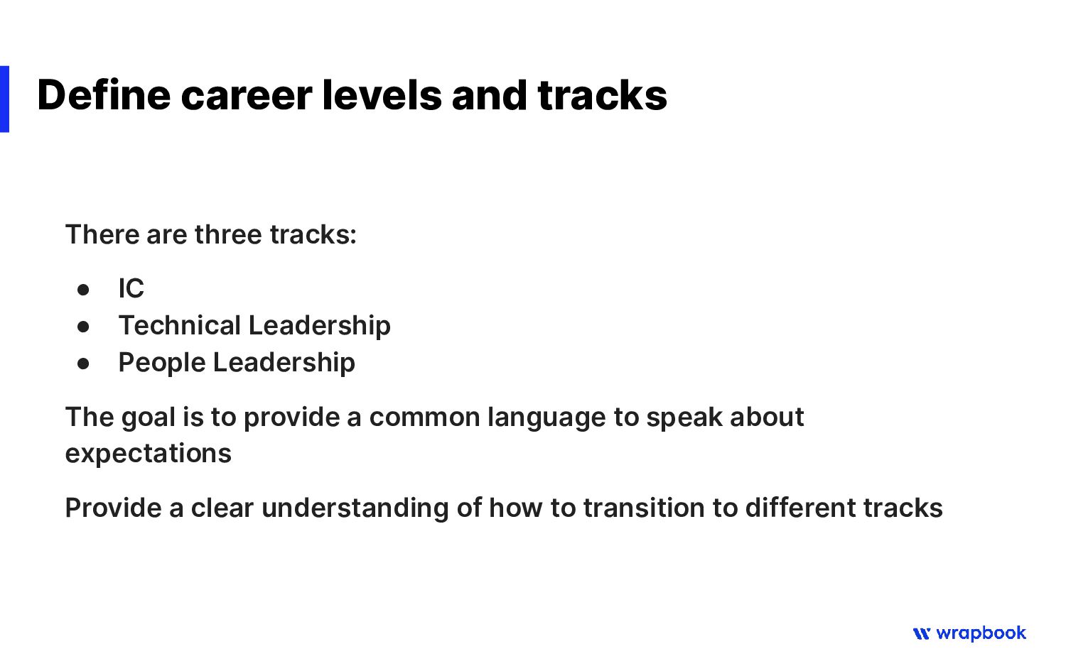 IC • Technical Leadership • People Leadership The goal is to provide a common language to speak about expectations Provide a clear understanding of how to transition to different tracks