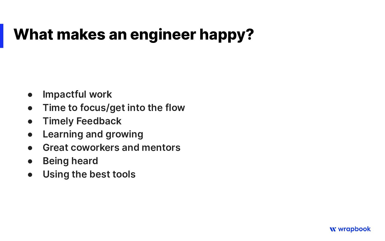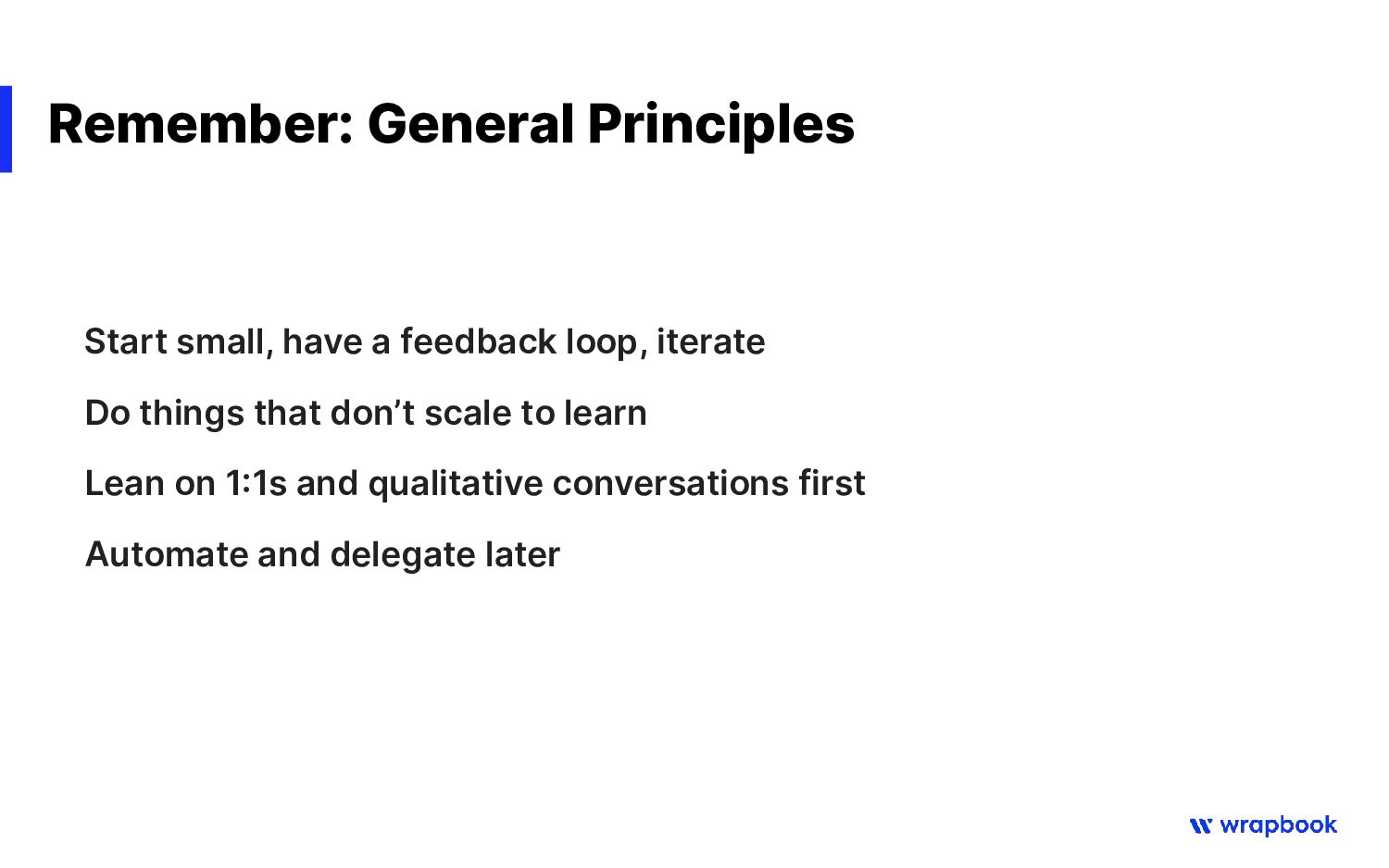 parameters ◦ What is the cadence? (e.g. weekly, biweekly, monthly?) ◦ When are scope, priorities and goals set? ◦ How to we improve the process and how we work? • Example from Wrapbook: ◦ Weekly Goals meeting ◦ Daily async stand-up ◦ Weekly Engineering+Product Leads prioritization ◦ Weekly Retrospectives + 1:1s