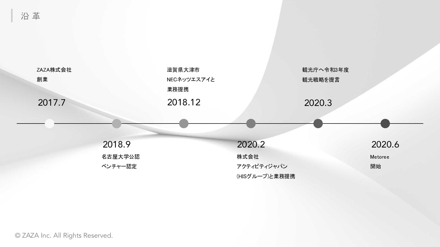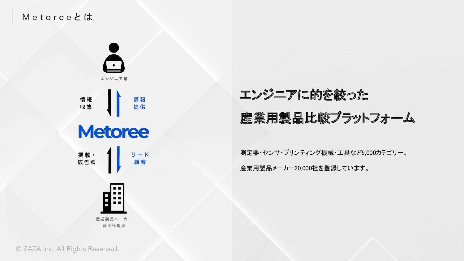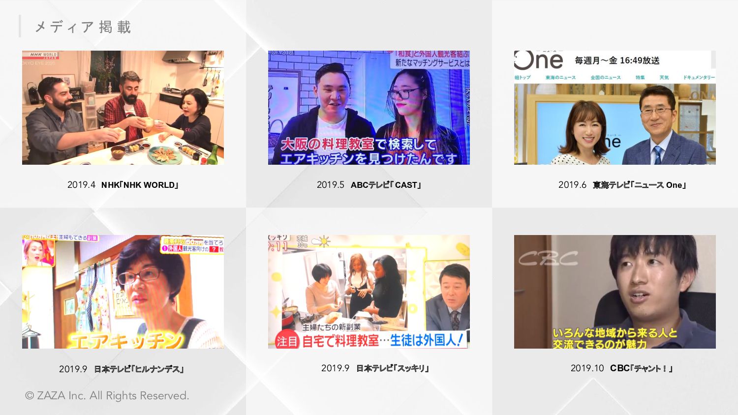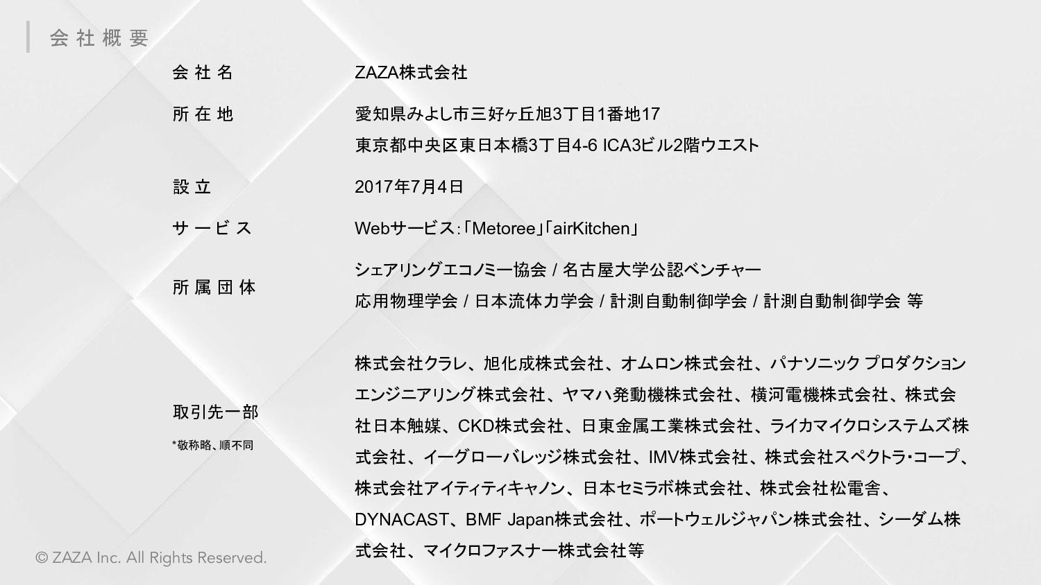 ZAZA株式会社 愛知県みよし市三好ヶ丘旭3丁目1番地17 東京都中央区東日本橋3丁目4-6 ICA3ビル2階ウエスト 2017年7月4日 Webサービス:「Metoree」「airKitchen」 シェアリングエコノミー協会 / 名古屋大学公認ベンチャー 応用物理学会 / 日本流体力学会 / 計測自動制御学会 / 計測自動制御学会 等 株式会社クラレ、 旭化成株式会社、 オムロン株式会社、 パナソニック プロダクション エンジニアリング株式会社、 ヤマハ発動機株式会社、 横河電機株式会社、 株式会 社日本触媒、 CKD株式会社、 日東金属工業株式会社、 ライカマイクロシステムズ株 式会社、 イーグローバレッジ株式会社、 IMV株式会社、 株式会社スペクトラ・コープ、 株式会社アイティティキャノン、 日本セミラボ株式会社、 株式会社松電舎、 DYNACAST、 BMF Japan株式会社、 ポートウェルジャパン株式会社、 シーダム株 式会社、 マイクロファスナー株式会社等 会 社 名 所 在 地 設 立 サ ー ビ ス 所 属 団 体 取引先一部 *敬称略、順不同