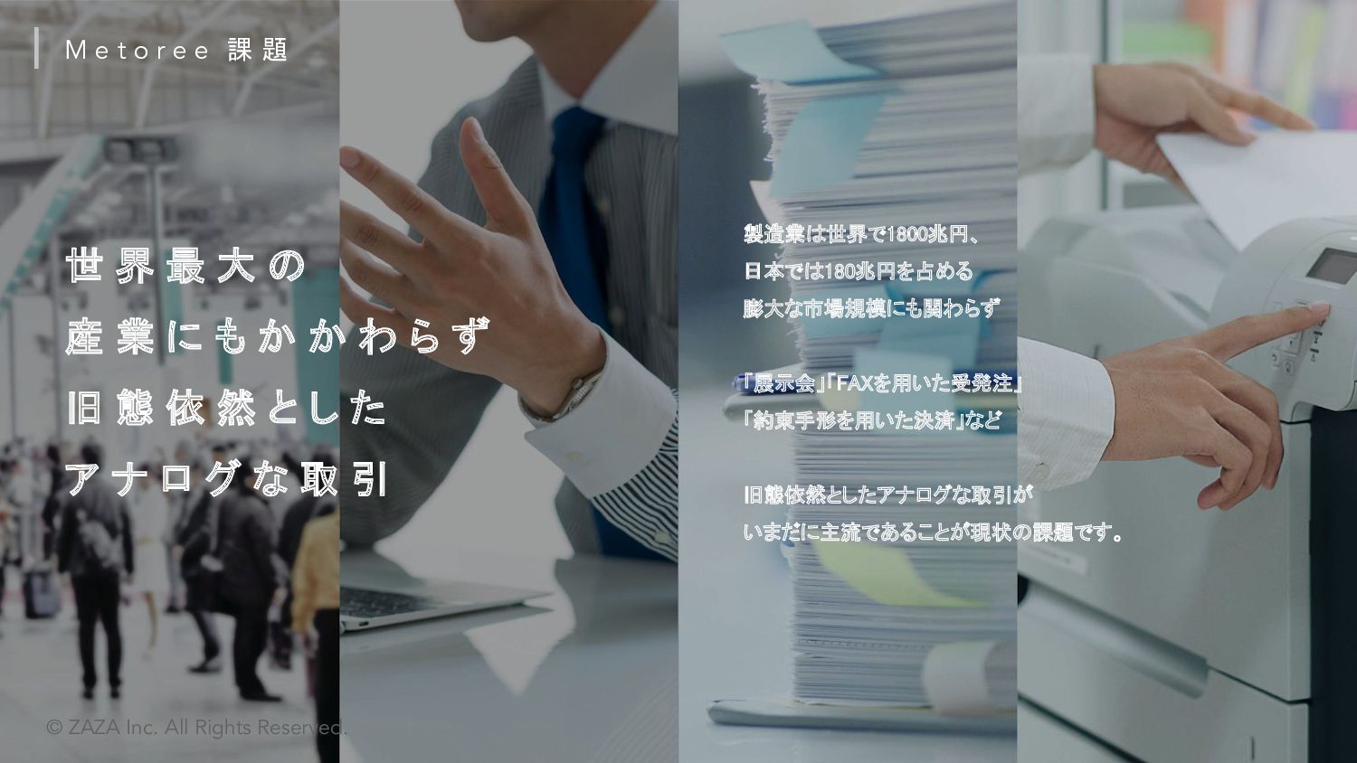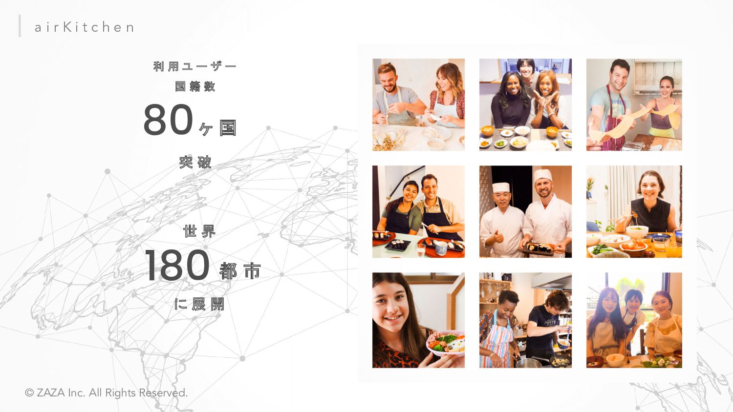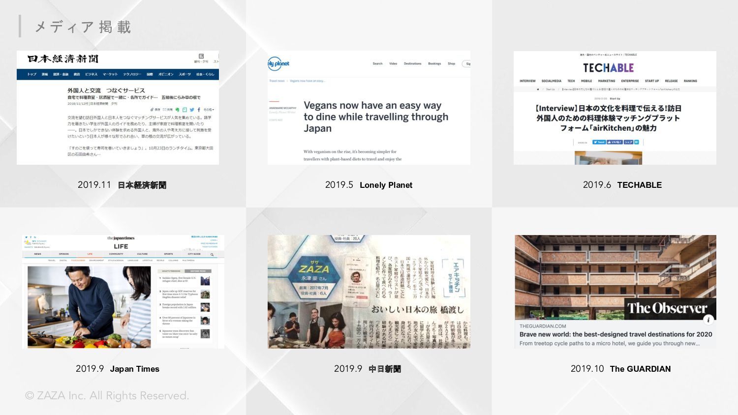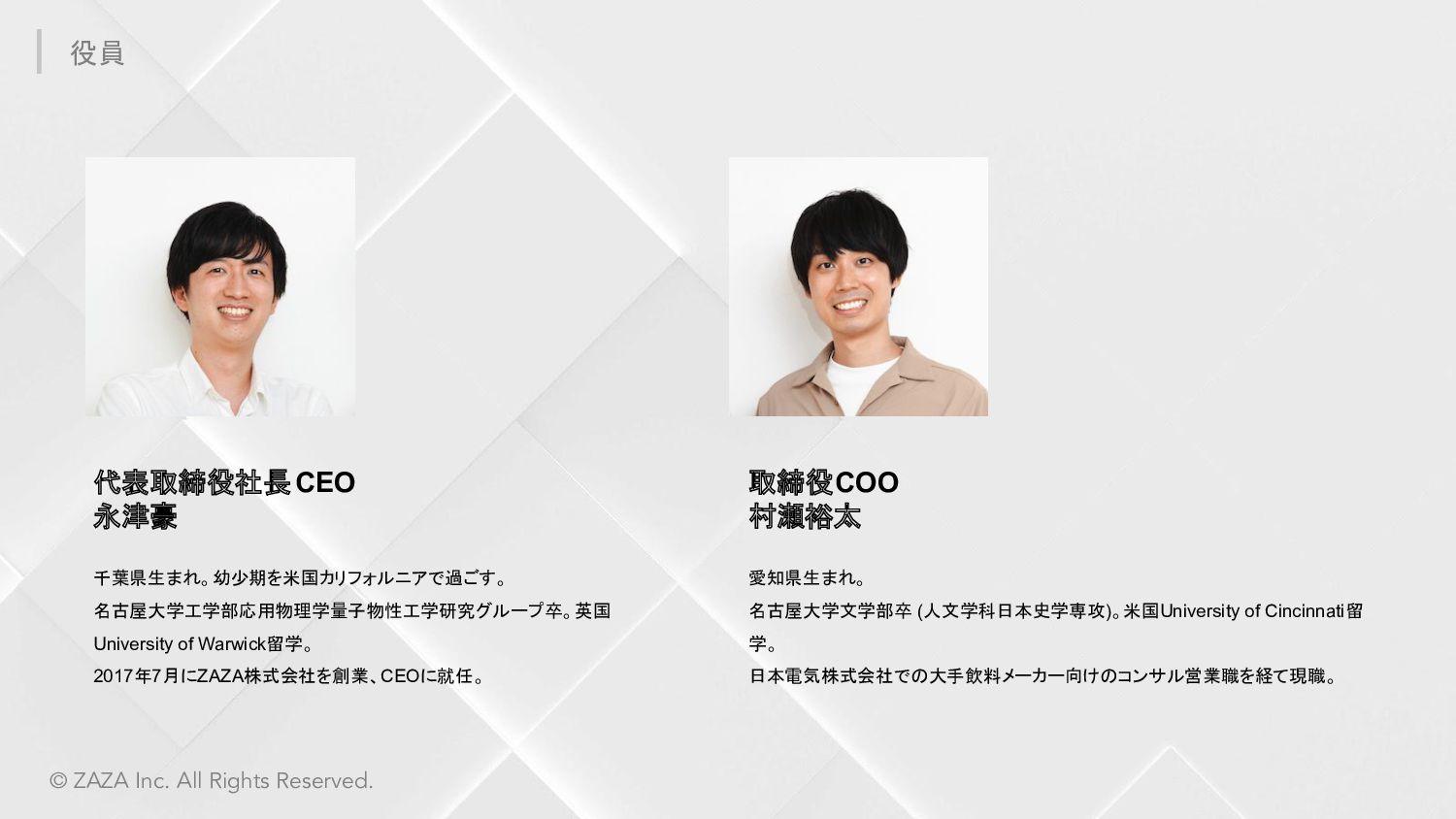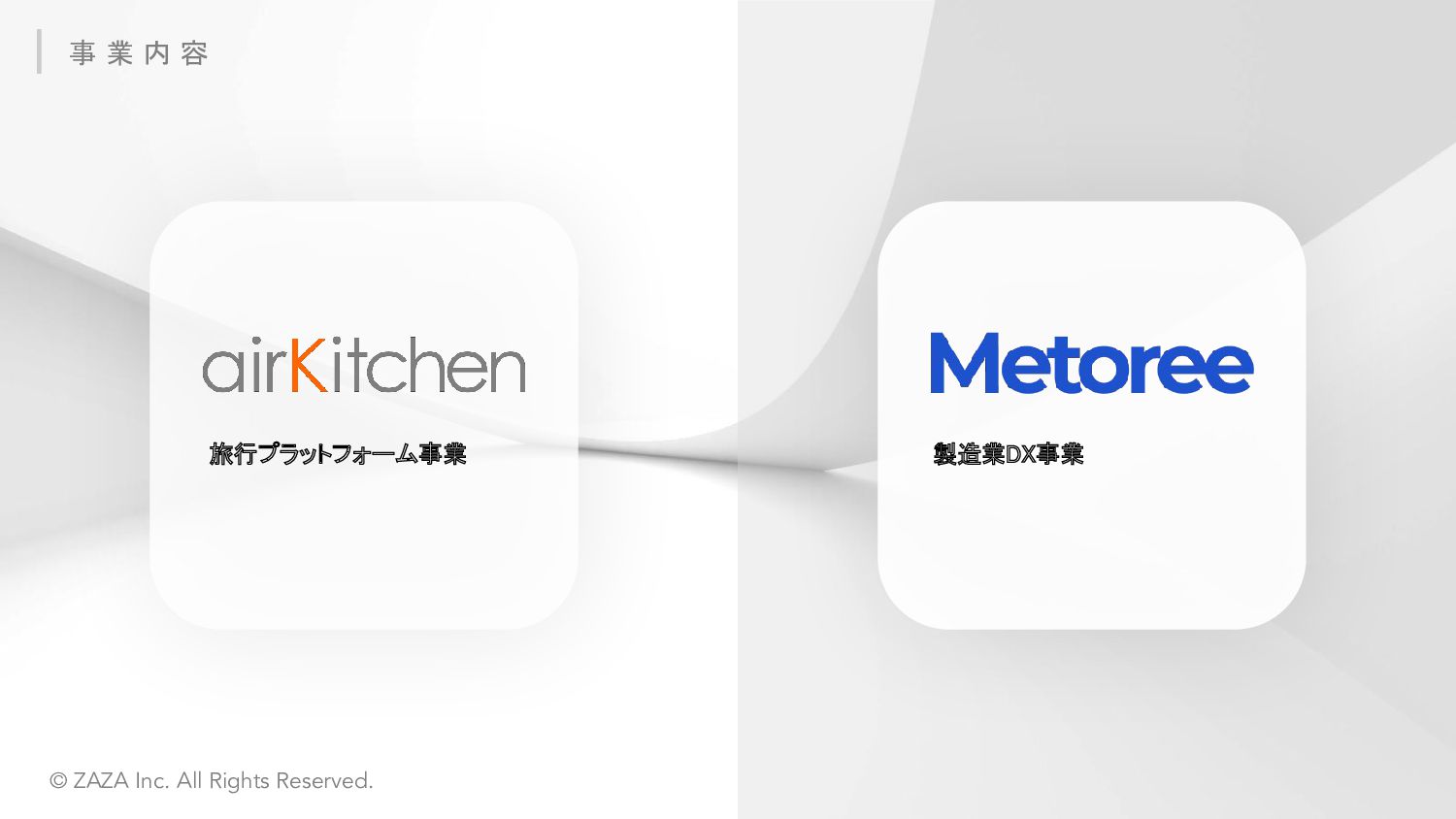 ZAZA株式会社 愛知県みよし市三好ヶ丘旭3丁目1番地17 東京都中央区東日本橋3丁目4-6 ICA3ビル2階ウエスト 2017年7月4日 Webサービス:「Metoree」「airKitchen」 シェアリングエコノミー協会 / 名古屋大学公認ベンチャー 応用物理学会 / 日本流体力学会 / 計測自動制御学会 / 計測自動制御学会 等 株式会社クラレ、 旭化成株式会社、 オムロン株式会社、 パナソニック プロダクション エンジニアリング株式会社、 ヤマハ発動機株式会社、 横河電機株式会社、 株式会 社日本触媒、 CKD株式会社、 日東金属工業株式会社、 ライカマイクロシステムズ株 式会社、 イーグローバレッジ株式会社、 IMV株式会社、 株式会社スペクトラ・コープ、 株式会社アイティティキャノン、 日本セミラボ株式会社、 株式会社松電舎、 DYNACAST、 BMF Japan株式会社、 ポートウェルジャパン株式会社、 シーダム株 式会社、 マイクロファスナー株式会社等 会 社 名 所 在 地 設 立 サ ー ビ ス 所 属 団 体 取引先一部 *敬称略、順不同