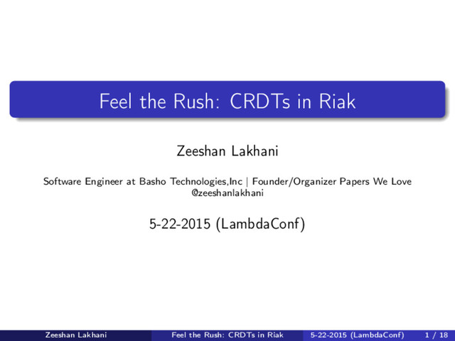 Reconciling conflicts in eventually consistent distributed systems can be messy adventure, but conflict-free replicated datatypes (CRDT’s) offer a solution where updates are accepted without remote synchronization and replicas properly converge into an equivalent state. Riak Data Types bring CRDTs to the server side, making data modeling simpler and skipping the need to roll your own conflict resolution logic. More than anything, these data types make some of the recent research in strong eventual consistency real and practical, and I’ll demo #howitdoesit.
