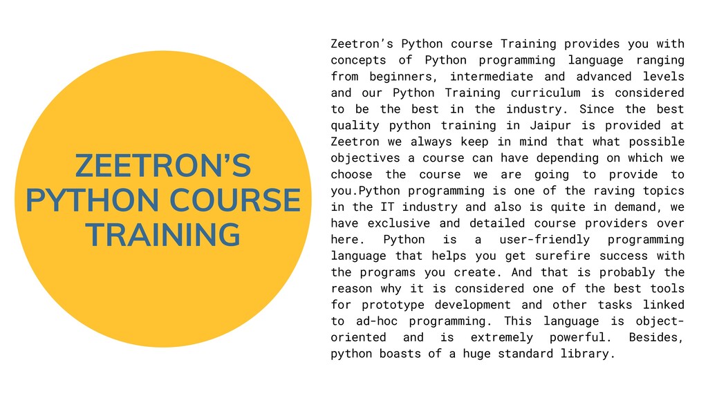with concepts of Python programming language ranging from beginners, intermediate and advanced levels and our Python Training curriculum is considered to be the best in the industry. Since the best quality python training in Jaipur is provided at Zeetron we always keep in mind that what possible objectives a course can have depending on which we choose the course we are going to provide to you.Python programming is one of the raving topics in the IT industry and also is quite in demand, we have exclusive and detailed course providers over here. Python is a user-friendly programming language that helps you get surefire success with the programs you create. And that is probably the reason why it is considered one of the best tools for prototype development and other tasks linked to ad-hoc programming. This language is object- oriented and is extremely powerful. Besides, python boasts of a huge standard library.