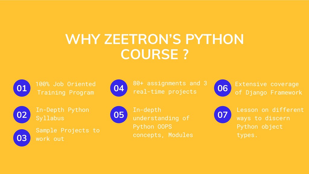 01 02 03 In-Depth Python Syllabus Sample Projects to work out 80+ assignments and 3 real-time projects 04 05 In-depth understanding of Python OOPS concepts, Modules Extensive coverage of Django Framework 06 07 Lesson on different ways to discern Python object types.