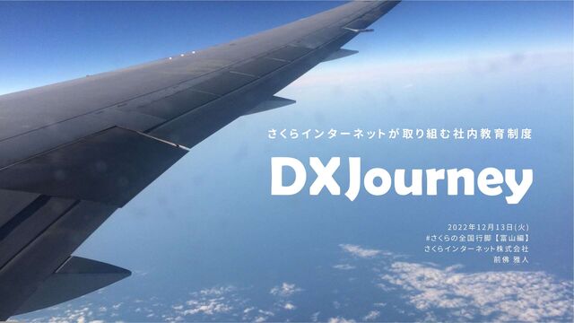 「【富山編】さくらの全国行脚オンラインイベント」発表資料です。 日時:2022年12月13日(火) 19:00-21:00 場所:オンライン開催(Zoom) URL:https://sakura-tokai.doorkeeper.jp/events/147347 ---- 私が取り組んでいる社内教育制度「DX Journey」の背景について発表しました。「学校支援プロジェクト」での気付き、社内での実践、課題感をまとめています。