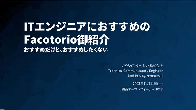 1 ITエンジニアにおすすめの Facotorio御紹介 おすすめだけと、おすすめしたくない さくらインターネット株式会社 Technical Communicator / Engineer 前佛