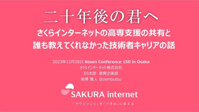8月 9月 9/19 10月以降~ KOSEN フォーラム 2023 ポスターセッション オンライン出展 ※当社取り組み紹介、先生方とのディスカッション 高知高専 石川高専 8/31 デジタル人材リテラシー講座で学生向けに講義 バーチャル石狩データセンター見学会実施 7/12, 14 コンピュータ部向けクラウド講習/ハンズオン実施 さくらのクラウドを提供開始(サーバ合計33台) 5/16,17 4/12 ミーティングでモデル校候補として 高知高専への往訪を決定 さくらが提供可能な教育 コンテンツのリストアップ 先生方に当社slackへご参加いただく 高知高専訪問、授業見学 先生方とのディスカッション 授業実施に向けたコンテンツ検討・作成 後期実施の授業内容検討 スケジュール調整 授業実施(実習枠) 90分×2コマを 2回実施予定 ※クラウドとセキュリティについての講習 来年度シラバス検討 7/3 前佛客員准教授プレスリリース発表 KOSENフォーラム 出展検討 プレスリリース準備 6/28 提供方法やスケジュールの ディスカッション 7/28 申し込み方法や流れの協議 スケジュールの確定 9/12 受付開始 (~9/26) 採択校選定 詳細協議 11月~実施