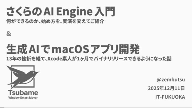 さくらの AI Engine 入門 何ができるのか、始め方を、実演を交えてご紹介 & 生成 AI で macOS アプリ開発 13年の挫折を経て、Xcode素人が1ヶ月でバイナリリリースできるようになった話