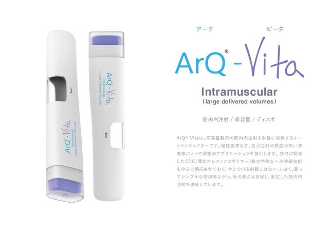 ( ) ArQ®-Vitaは、 高容量製剤の筋肉内注射を手軽に実現するオー トインジェクターです。 慢性疾患など、 自己注射の頻度の高い患 者様にとって理想のアプリケーションを提供します。 独自に開発 したCOC