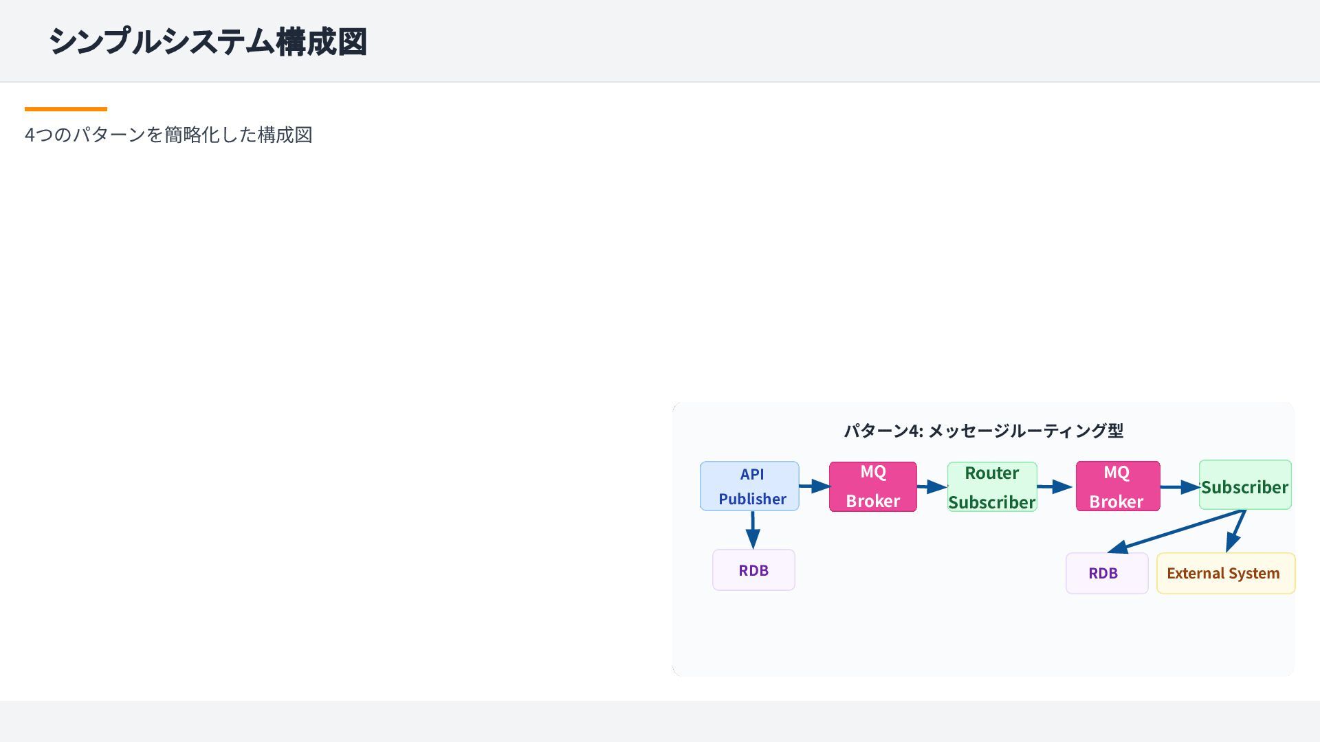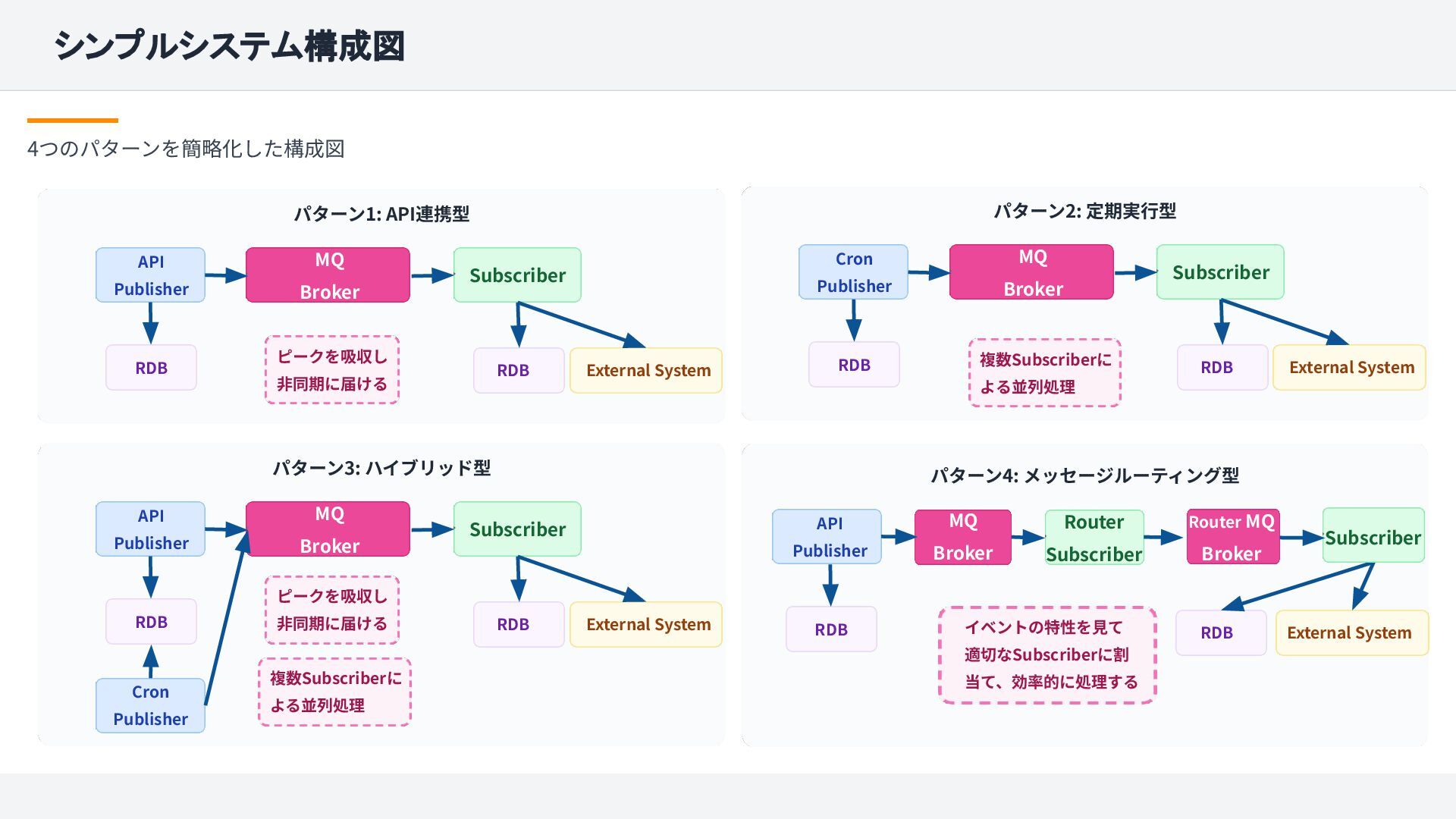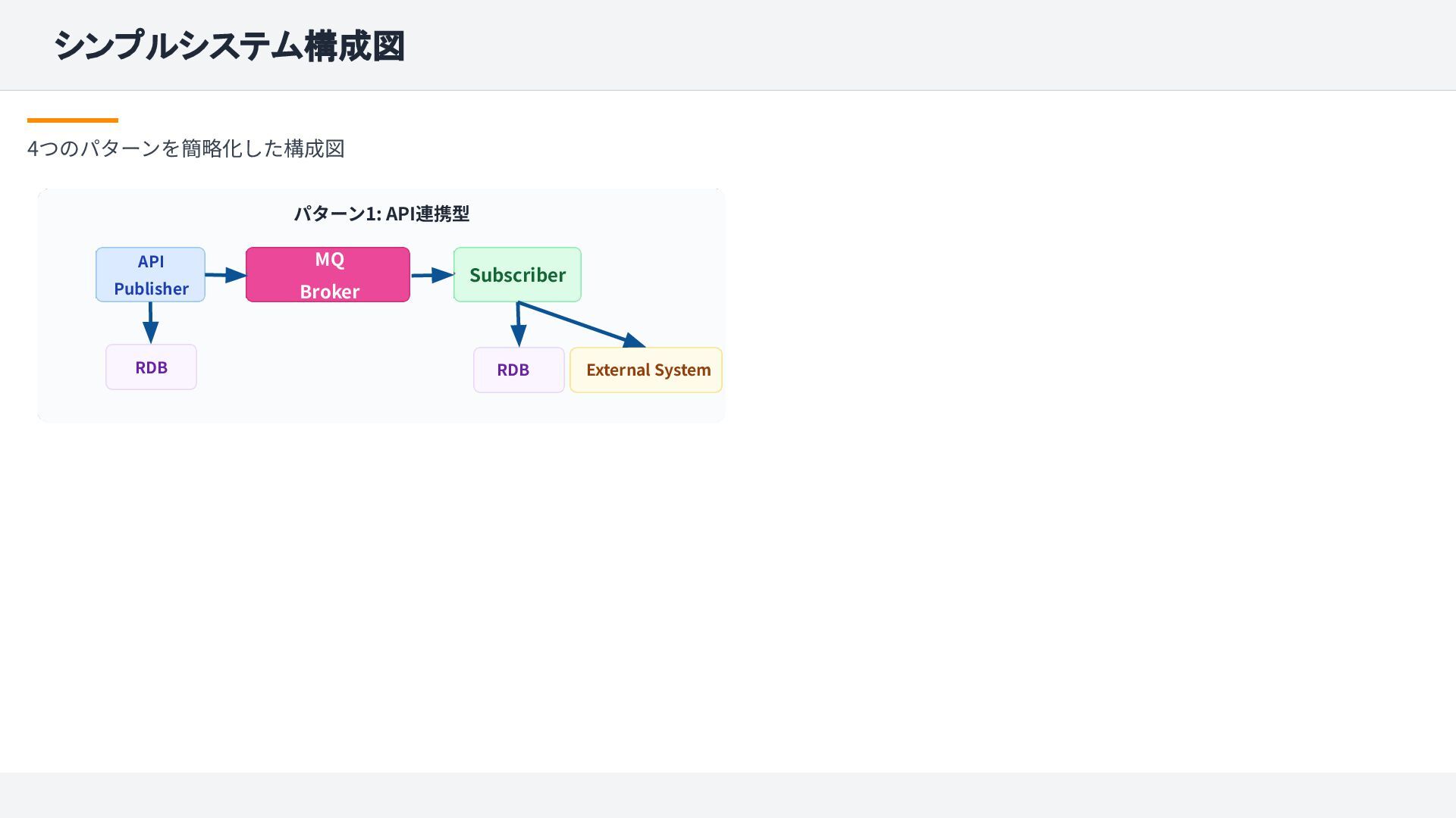 3. シンプルシステム構成図 4つのパターンを簡略化した構成図 パターン1: API連携型 MQ Broker Subscriber External System API