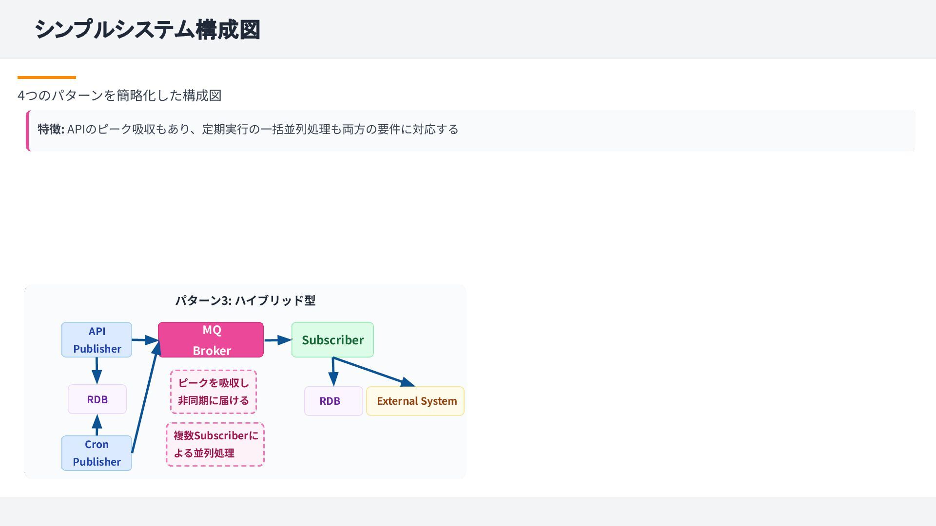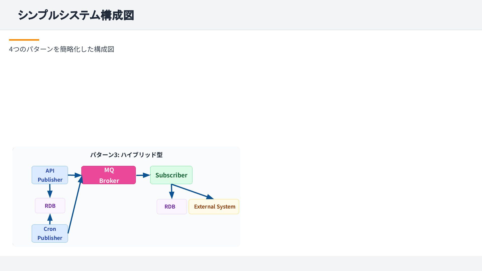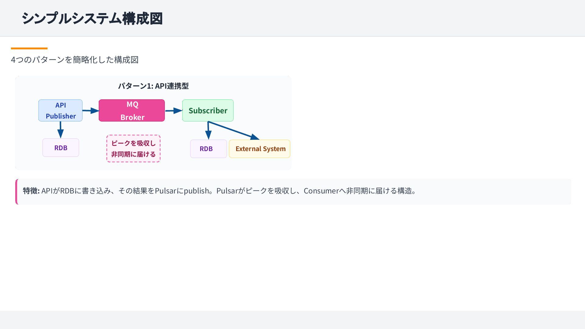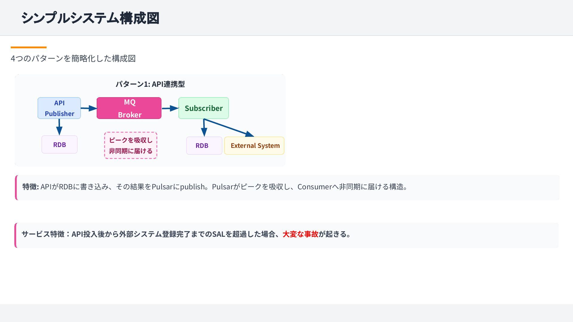 3. シンプルシステム構成図 4つのパターンを簡略化した構成図 パターン1: API連携型 MQ Broker Subscriber External System API
