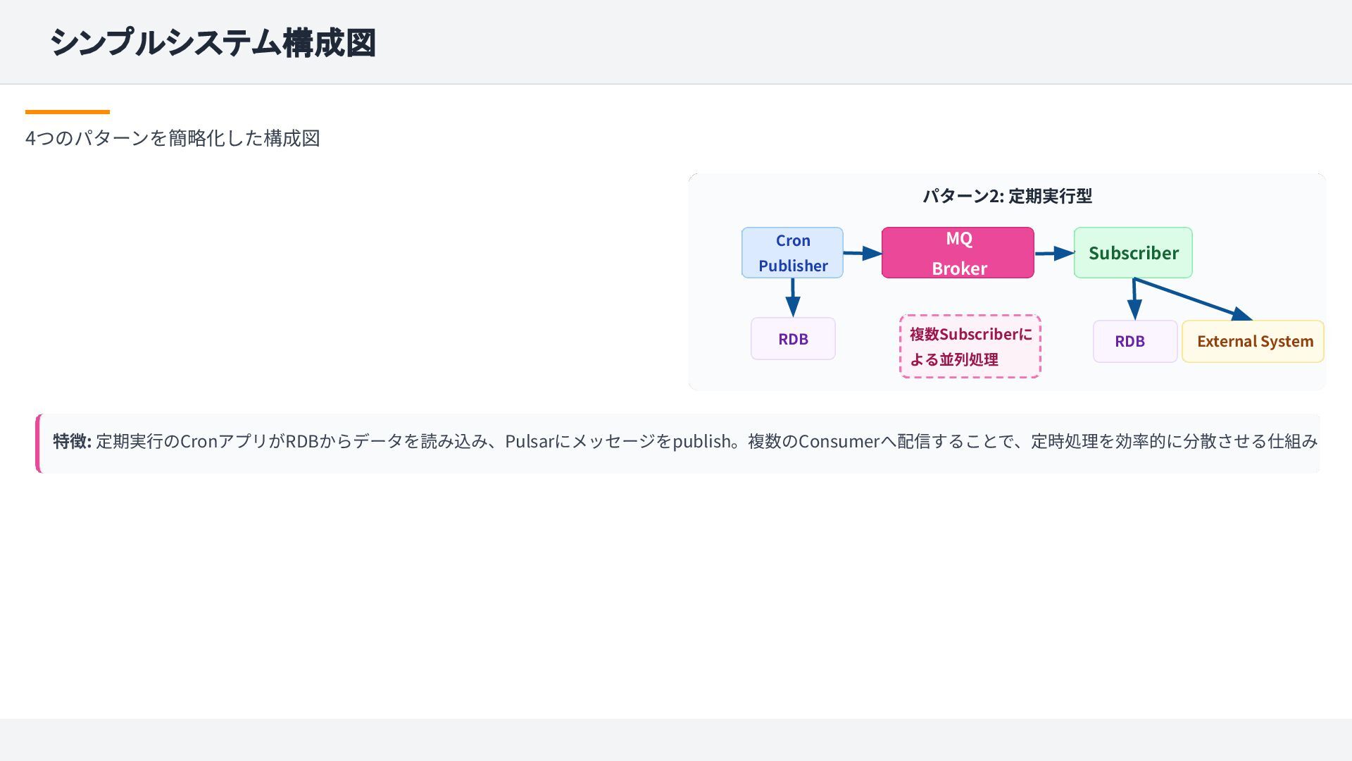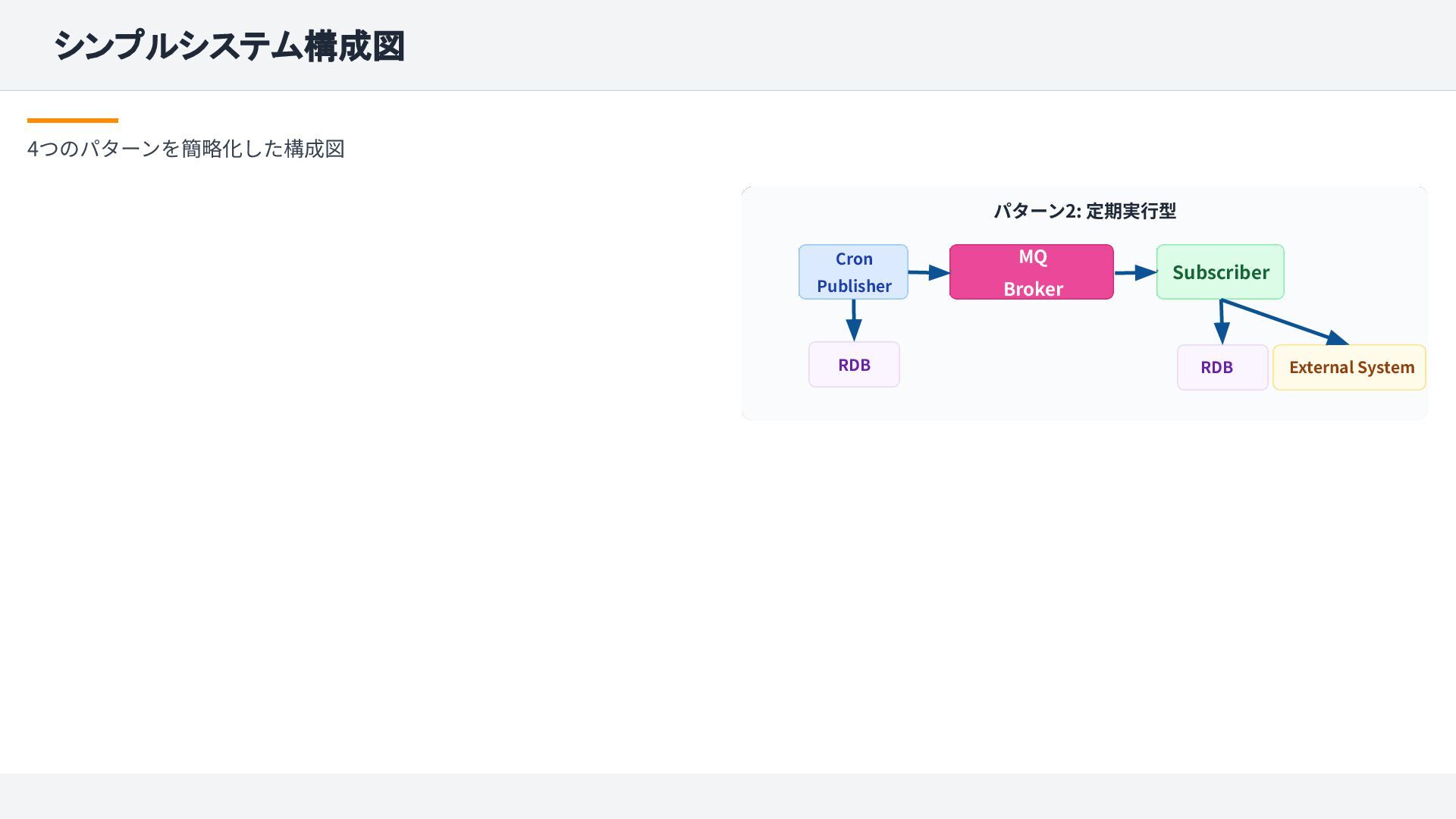4. シンプルシステム構成図 4つのパターンを簡略化した構成図 パターン2: 定期実⾏型 MQ Broker Subscriber External System Cron