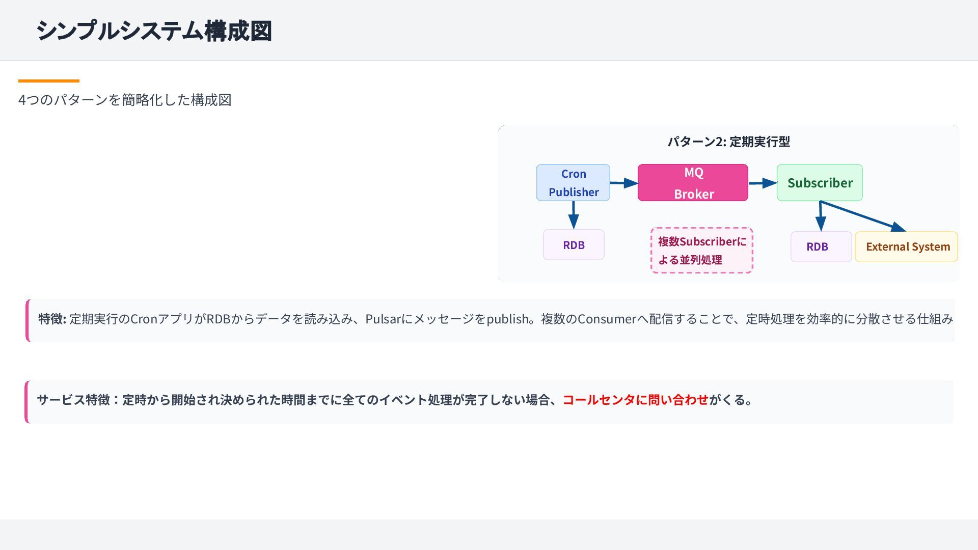 Publisher RDB RDB Router サービス特徴:定時から開始され決められた時間までに全てのイベント処理が完了しない場合、コールセンタに問い合わせがくる。 特徴: 定期実⾏のCronアプリがRDBからデータを読み込み、Pulsarにメッセージをpublish。複数のConsumerへ配信することで、定時処理を効率的に分散させる仕組み 複数Subscriberに よる並列処理
