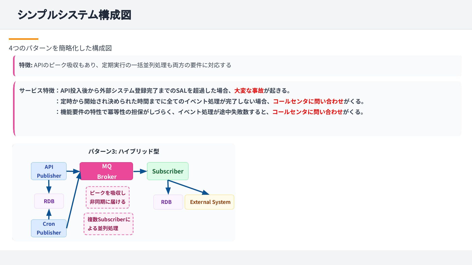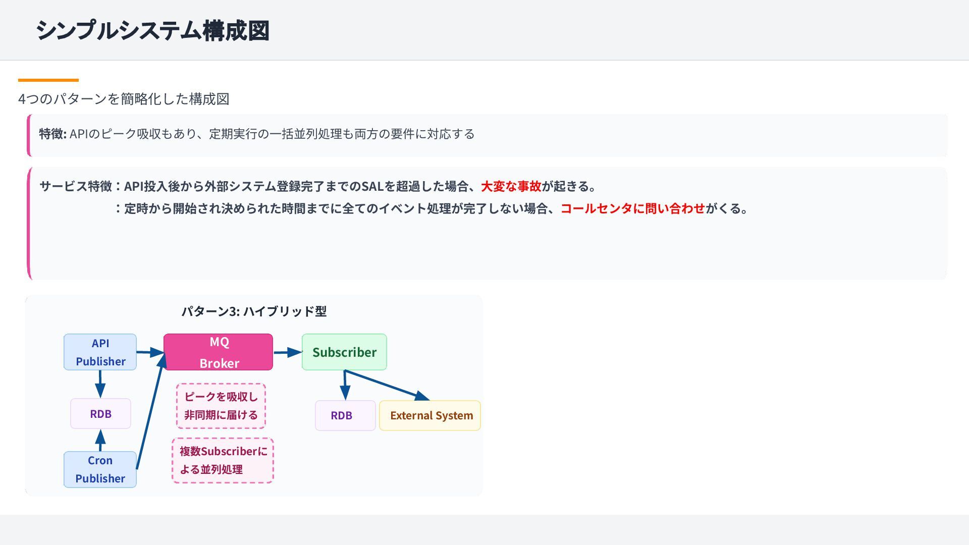 Publisher RDB RDB パターン1: API連携型 MQ Broker Subscriber External System API Publisher RDB RDB パターン3: ハイブリッド型 MQ Broker Subscriber External System API Publisher RDB RDB Cron Publisher Router Light Topic パターン4: メッセージルーティング型 MQ Broker Router Subscriber External System API Publisher RDB RDB Router MQ Broker Subscriber イベントの特性を⾒て 適切なSubscriberに割 当て、効率的に処理する ピークを吸収し ⾮同期に届ける 複数Subscriberに よる並列処理 複数Subscriberに よる並列処理 ピークを吸収し ⾮同期に届ける