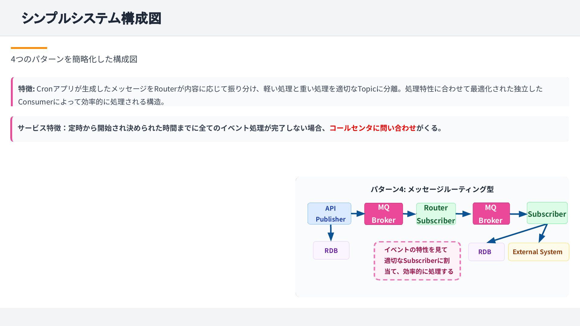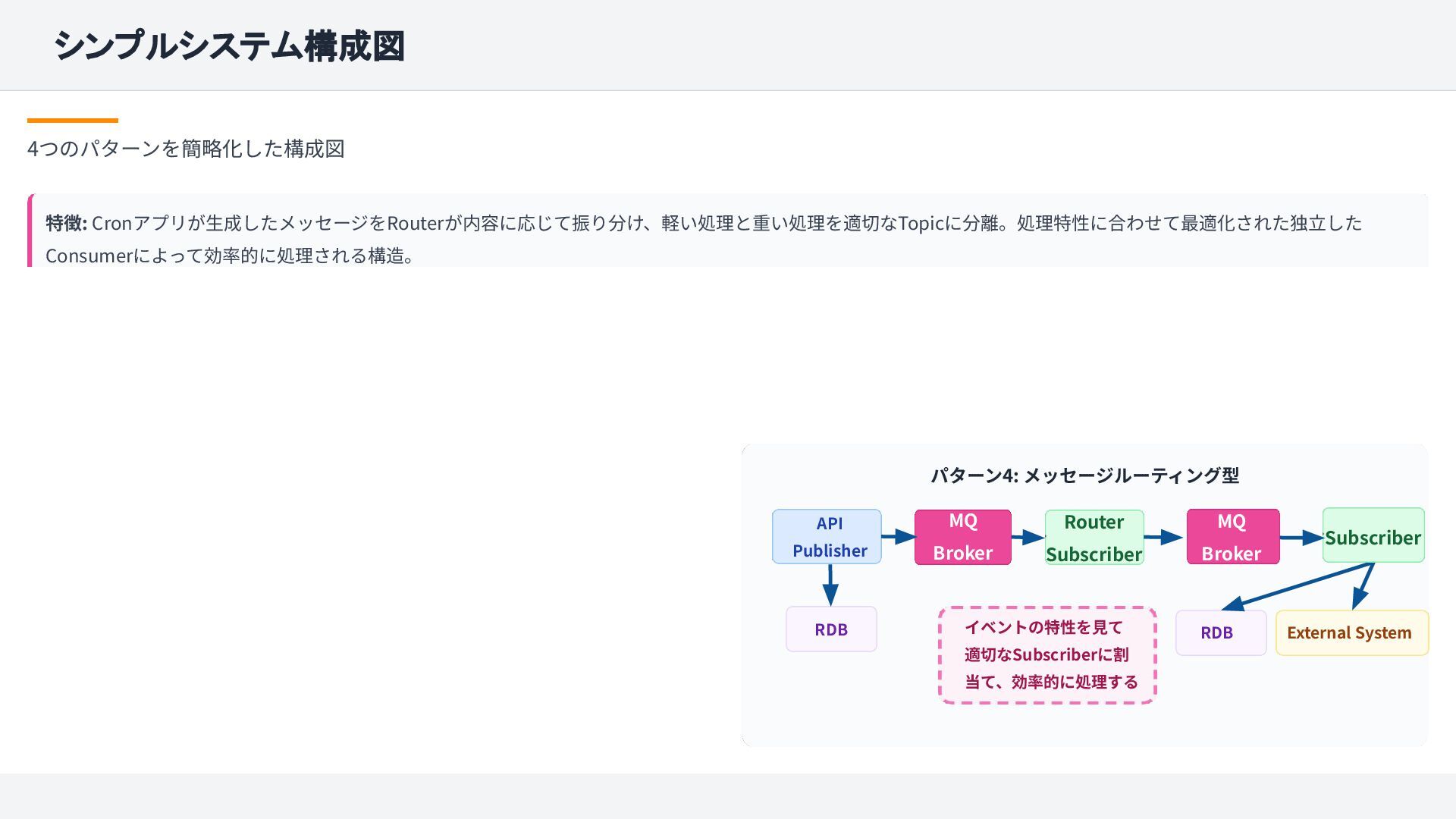 System API Publisher RDB RDB MQ Broker Subscriber 特徴: Cronアプリが⽣成したメッセージをRouterが内容に応じて振り分け、軽い処理と重い処理を適切なTopicに分離。処理特性に合わせて最適化された独⽴した Consumerによって効率的に処理される構造。 イベントの特性を⾒て 適切なSubscriberに割 当て、効率的に処理する