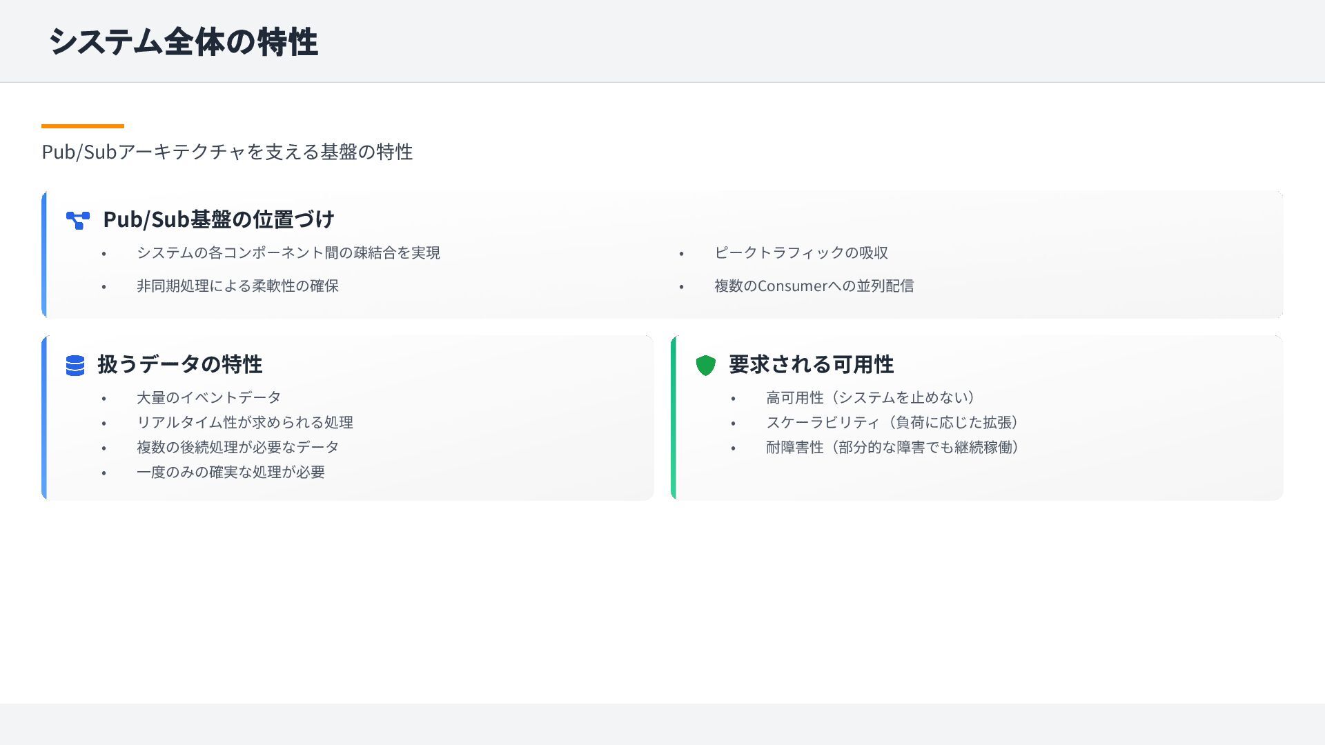 複数のConsumerへの並列配信 扱うデータの特性 • ⼤量のイベントデータ • リアルタイム性が求められる処理 • 複数の後続処理が必要なデータ • ⼀度のみの確実な処理が必要 要求される可⽤性 • ⾼可⽤性(システムを⽌めない) • スケーラビリティ(負荷に応じた拡張) • 耐障害性(部分的な障害でも継続稼働)