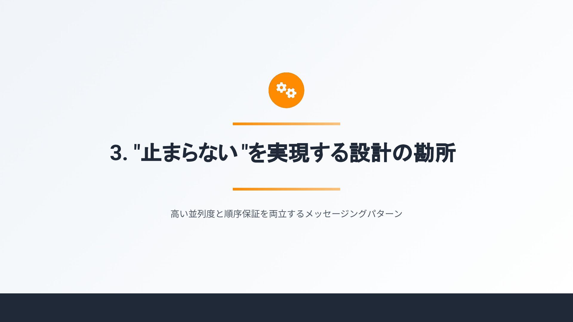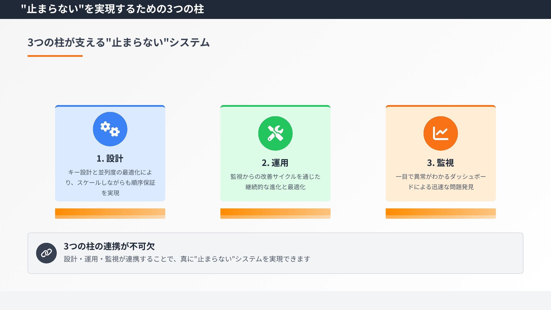 27. "⽌まらない"を実現するための3つの柱 3つの柱が⽀える"⽌まらない"システム 1. 設計 キー設計と並列度の最適化によ り、スケールしながらも順序保証 を実現 2. 運⽤ 監視からの改善サイクルを通じた