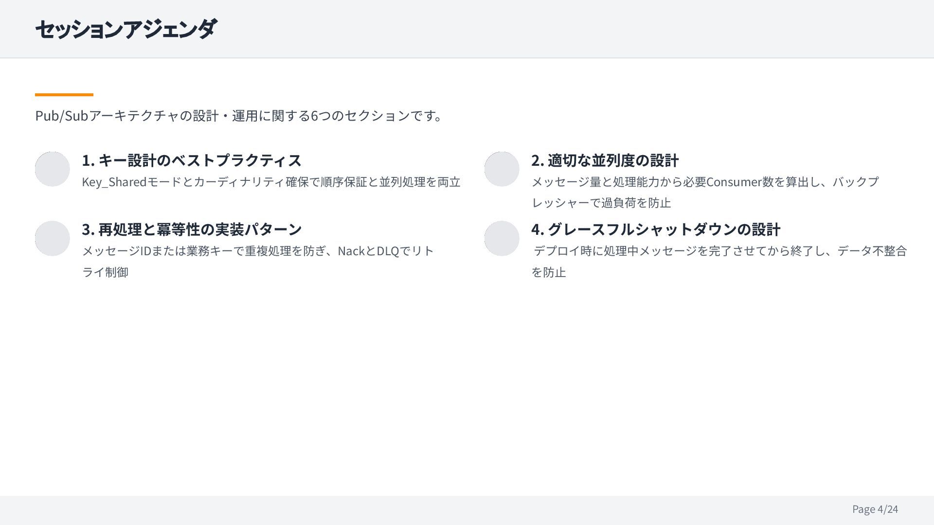 再処理と冪等性の実装パターン メッセージIDまたは業務キーで重複処理を防ぎ、NackとDLQでリト ライ制御 4. グレースフルシャットダウンの設計 デプロイ時に処理中メッセージを完了させてから終了し、データ不整合 を防⽌ Page 4/24