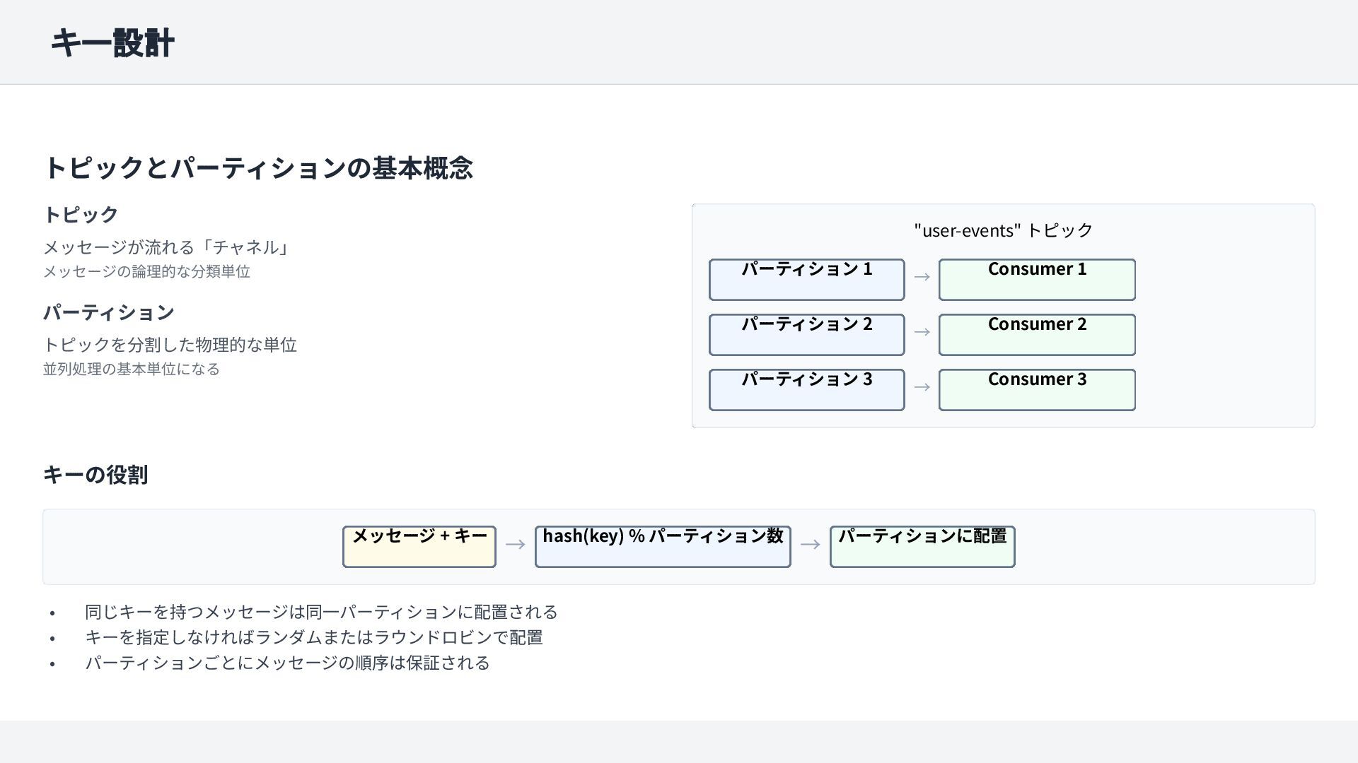 パーティション 1 → Consumer 1 パーティション 2 → Consumer 2 パーティション 3 → Consumer 3 キーの役割 メッセージ + キー → hash(key) % パーティション数 → パーティションに配置 • 同じキーを持つメッセージは同⼀パーティションに配置される • キーを指定しなければランダムまたはラウンドロビンで配置 • パーティションごとにメッセージの順序は保証される
