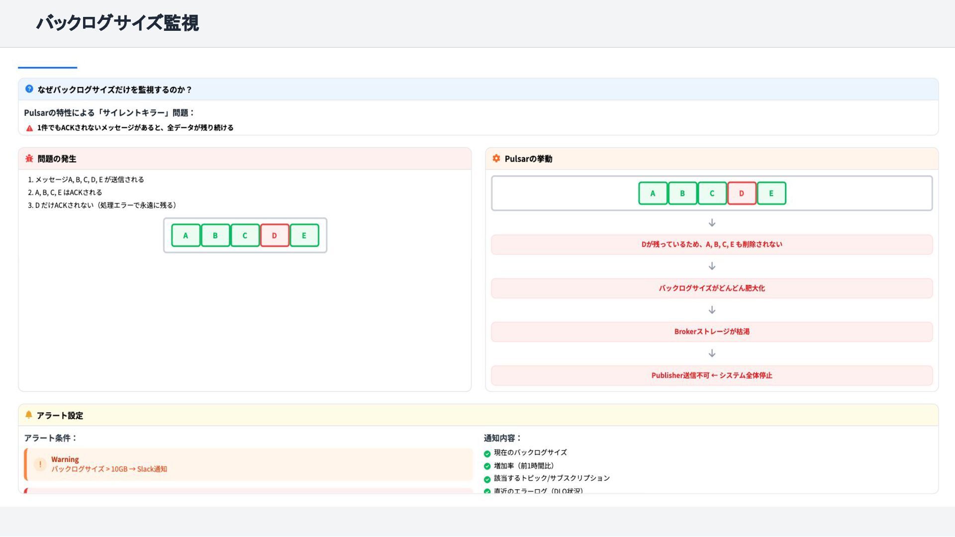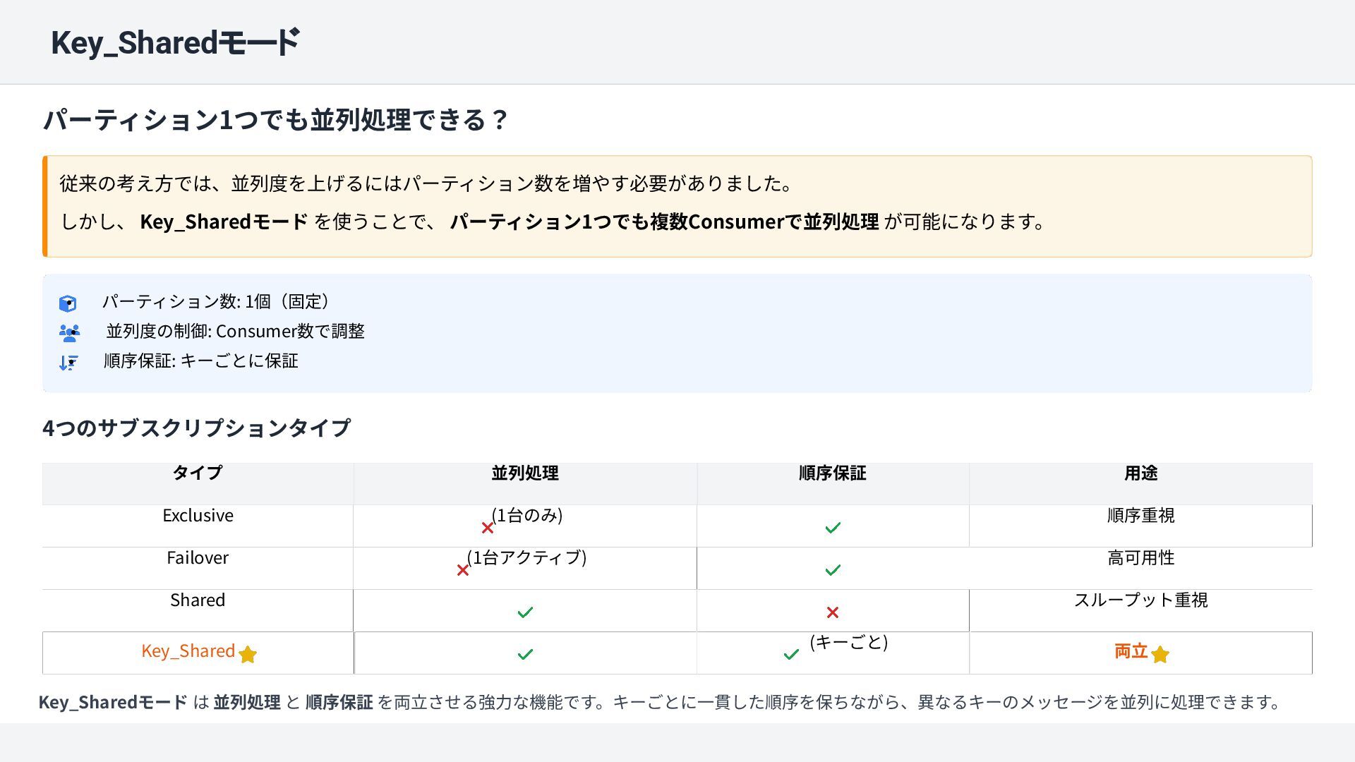 1個(固定) • 並列度の制御: Consumer数で調整 • 順序保証: キーごとに保証 4つのサブスクリプションタイプ タイプ 並列処理 順序保証 ⽤途 Exclusive (1台のみ) 順序重視 Failover (1台アクティブ) ⾼可⽤性 Shared スループット重視 Key_Shared  (キーごと) 両⽴ Key_Sharedモード は 並列処理 と 順序保証 を両⽴させる強⼒な機能です。キーごとに⼀貫した順序を保ちながら、異なるキーのメッセージを並列に処理できます。