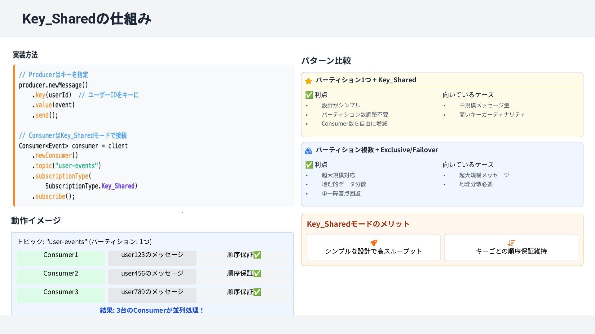 consumer = client . newConsumer () . topic ( "user-events" ) . subscriptionType ( SubscriptionType. ) . (); 動作イメージ トピック: "user-events" (パーティション: 1つ) Consumer1 user123のメッセージ 順序保証✅ Consumer2 user456のメッセージ 順序保証✅ Consumer3 user789のメッセージ 順序保証✅ 結果: 3台のConsumerが並列処理! パターン⽐較 パーティション1つ + Key_Shared ✅ 利点 • 設計がシンプル • パーティション数調整不要 • Consumer数を⾃由に増減 向いているケース • 中規模メッセージ量 • ⾼いキーカーディナリティ パーティション複数 + Exclusive/Failover ✅ 利点 • 超⼤規模対応 • 地理的データ分散 • 単⼀障害点回避 向いているケース • 超⼤規模メッセージ • 地理分散必要 Key_Sharedモードのメリット シンプルな設計で⾼スループット キーごとの順序保証維持