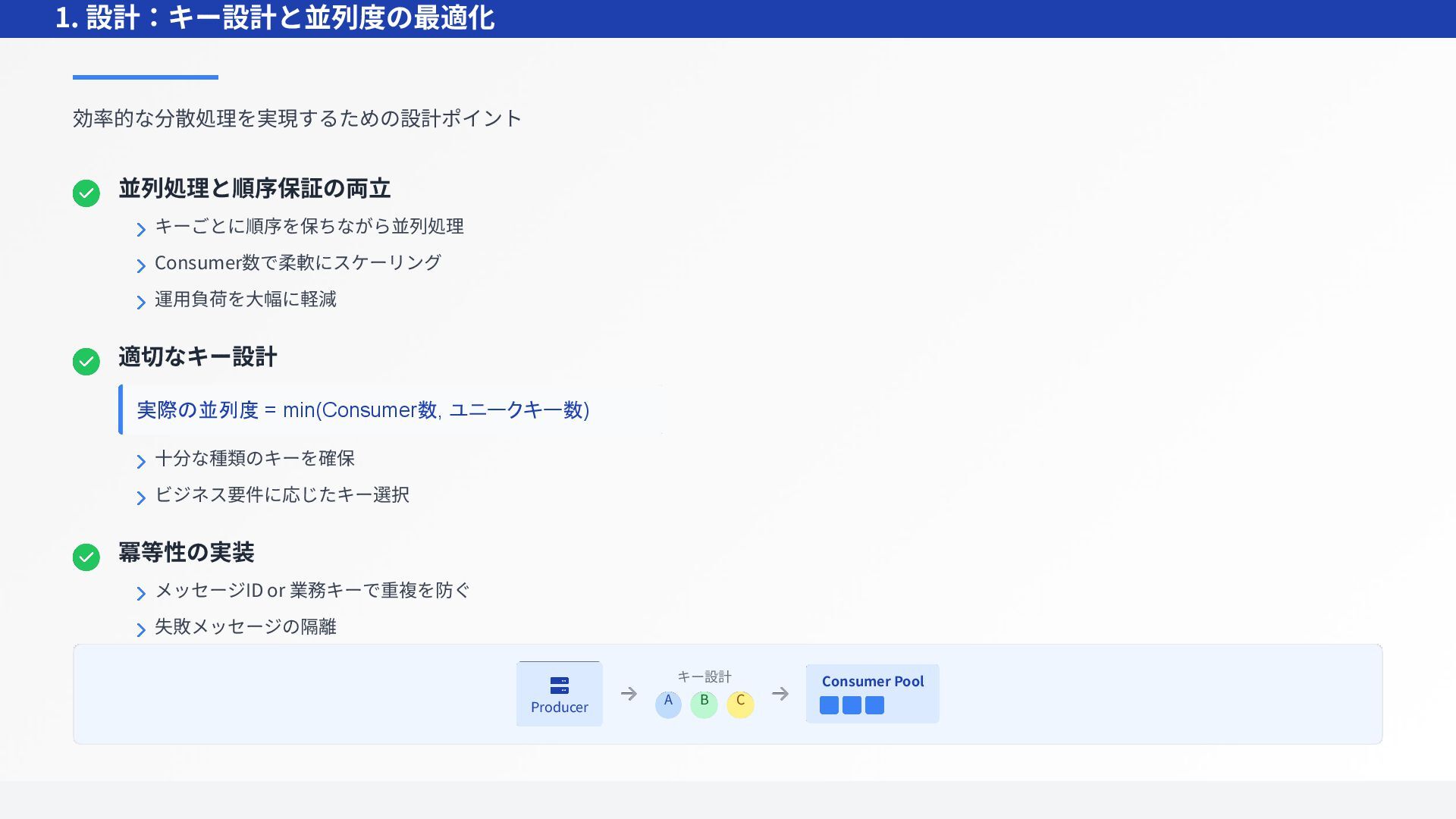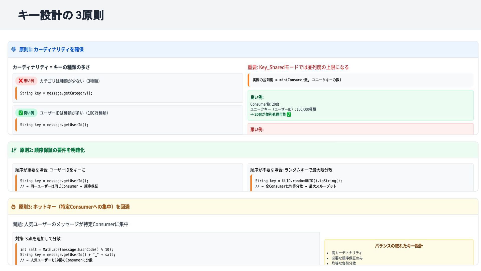 30台 ユニークキー(ユーザーID): 100,000種類 → 20台が並列処理可能 ✅ 悪い例: Consumer数: 20台 ユニークキー(カテゴリ): 3種類 → 3台のConsumerしか稼働しない ❌ 順序が不要な場合: ランダムキーで最⼤限分散 String key = UUID.randomUUID().toString(); // → 全Consumerに均等分散 → 最大スループット バランスの取れたキー設計 • ⾼カーディナリティ • 必要な順序保証のみ • 均等な負荷分散