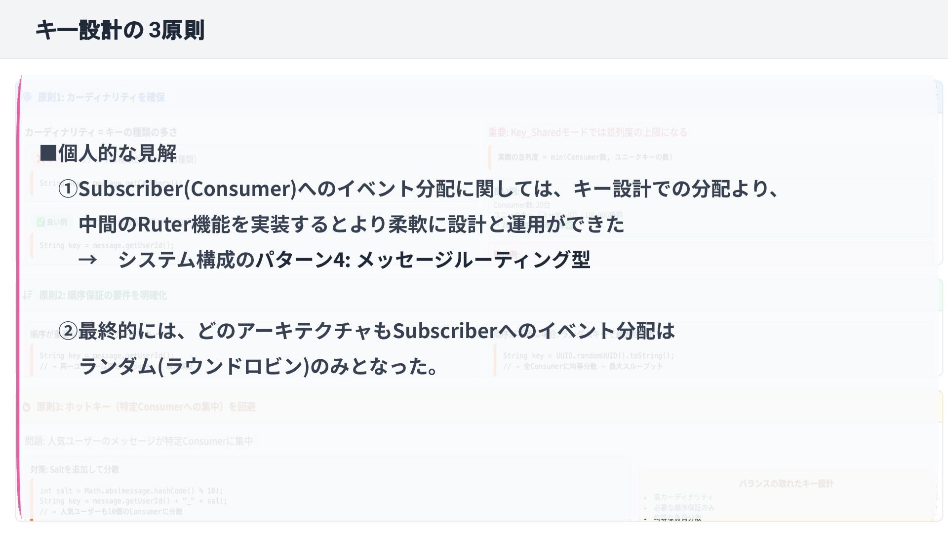 30台 ユニークキー(ユーザーID): 100,000種類 → 20台が並列処理可能 ✅ 悪い例: Consumer数: 20台 ユニークキー(カテゴリ): 3種類 → 3台のConsumerしか稼働しない ❌ 順序が不要な場合: ランダムキーで最⼤限分散 String key = UUID.randomUUID().toString(); // → 全Consumerに均等分散 → 最大スループット バランスの取れたキー設計 • ⾼カーディナリティ • 必要な順序保証のみ • 均等な負荷分散 ▪個⼈的な⾒解  ①Subscriber(Consumer)へのイベント分配に関しては、キー設計での分配より、   中間のRuter機能を実装するとより柔軟に設計と運⽤ができた   → システム構成のパターン4: メッセージルーティング型  ②最終的には、どのアーキテクチャもSubscriberへのイベント分配は   ランダム(ラウンドロビン)のみとなった。