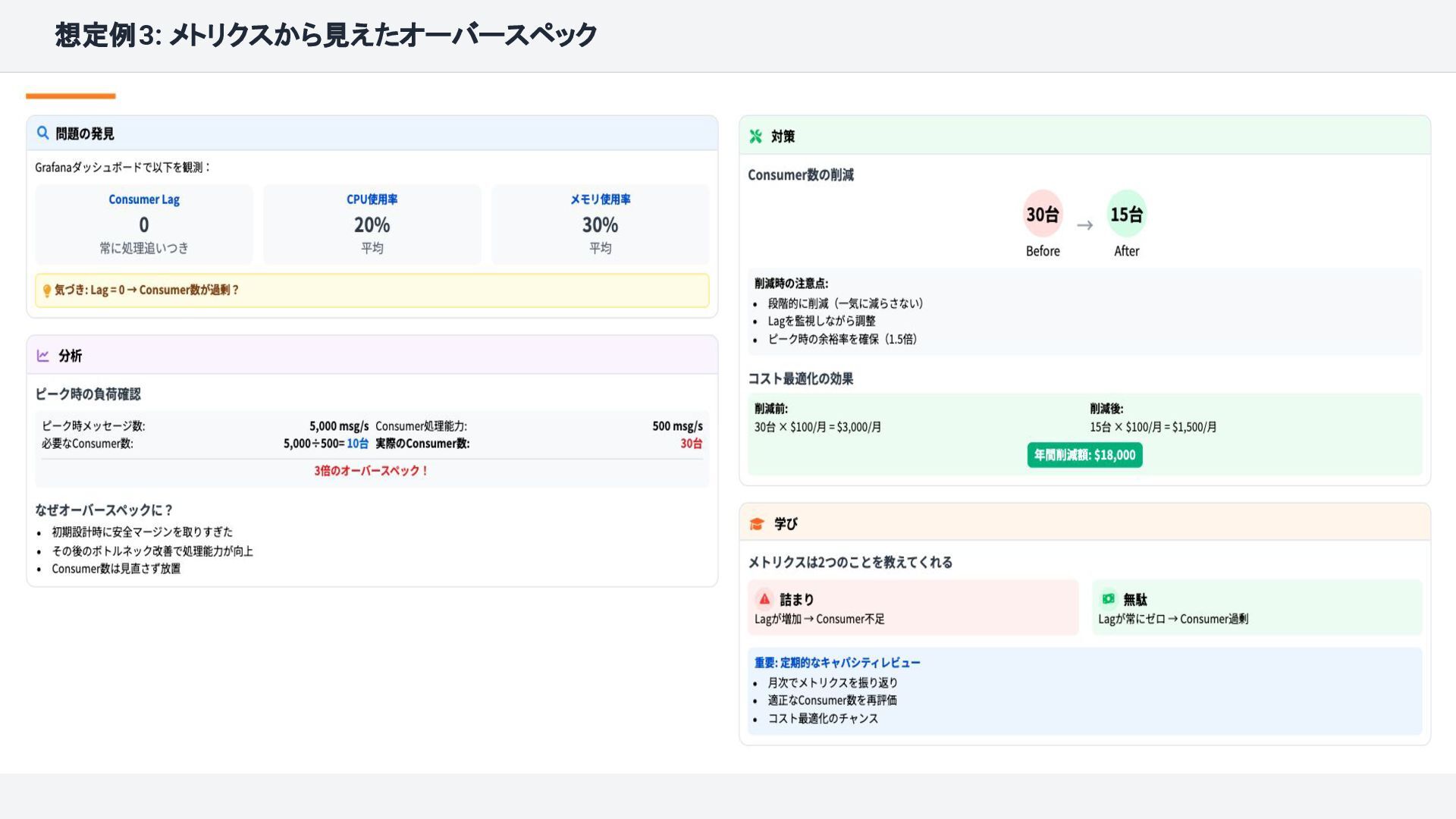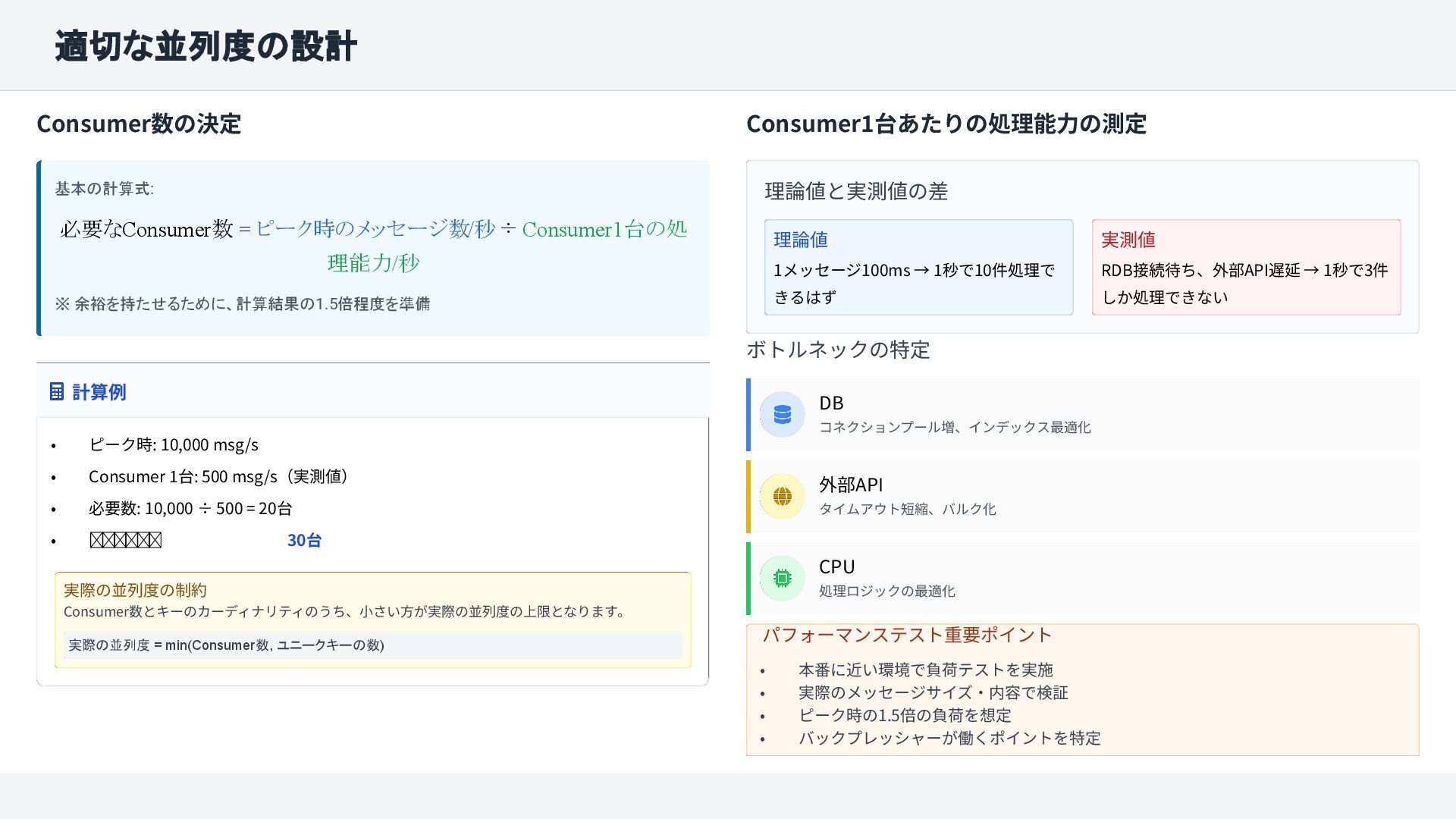 余裕を持たせるために、計算結果の1.5倍程度を準備 計算例 • ピーク時: 10,000 msg/s • Consumer 1台: 500 msg/s(実測値) • 必要数: 10,000 ÷ 500 = 20台 • 余裕を持たせて: 20 × 1.5 = 30台 実際の並列度の制約 Consumer数とキーのカーディナリティのうち、⼩さい⽅が実際の並列度の上限となります。 実際の並列度 = min(Consumer数, ユニークキーの数) Consumer1台あたりの処理能⼒の測定 理論値と実測値の差 理論値 1メッセージ100ms → 1秒で10件処理で きるはず 実測値 RDB接続待ち、外部API遅延 → 1秒で3件 しか処理できない ボトルネックの特定 DB コネクションプール増、インデックス最適化 外部API タイムアウト短縮、バルク化 CPU 処理ロジックの最適化 パフォーマンステスト重要ポイント • 本番に近い環境で負荷テストを実施 • 実際のメッセージサイズ‧内容で検証 • ピーク時の1.5倍の負荷を想定 • バックプレッシャーが働くポイントを特定