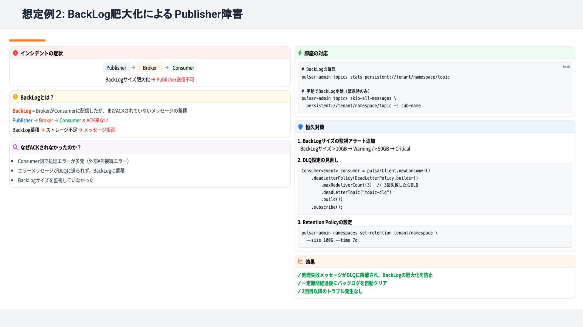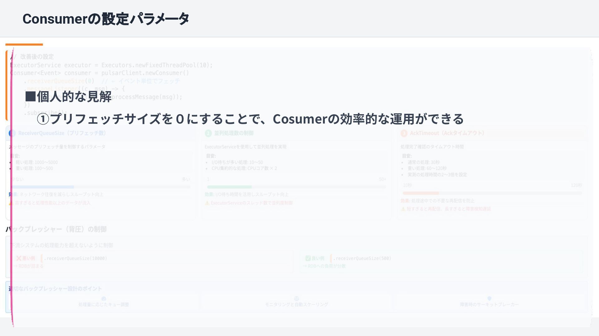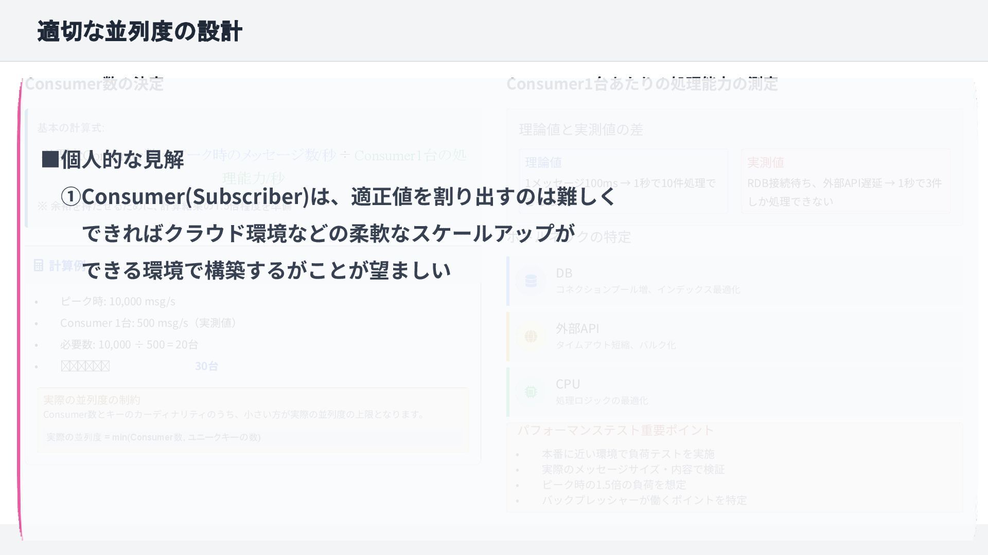 余裕を持たせるために、計算結果の1.5倍程度を準備 計算例 • ピーク時: 10,000 msg/s • Consumer 1台: 500 msg/s(実測値) • 必要数: 10,000 ÷ 500 = 20台 • 余裕を持たせて: 20 × 1.5 = 30台 実際の並列度の制約 Consumer数とキーのカーディナリティのうち、⼩さい⽅が実際の並列度の上限となります。 実際の並列度 = min(Consumer数, ユニークキーの数) Consumer1台あたりの処理能⼒の測定 理論値と実測値の差 理論値 1メッセージ100ms → 1秒で10件処理で きるはず 実測値 RDB接続待ち、外部API遅延 → 1秒で3件 しか処理できない ボトルネックの特定 DB コネクションプール増、インデックス最適化 外部API タイムアウト短縮、バルク化 CPU 処理ロジックの最適化 パフォーマンステスト重要ポイント • 本番に近い環境で負荷テストを実施 • 実際のメッセージサイズ‧内容で検証 • ピーク時の1.5倍の負荷を想定 • バックプレッシャーが働くポイントを特定 ▪個⼈的な⾒解  ①Consumer(Subscriber)は、適正値を割り出すのは難しく   できればクラウド環境などの柔軟なスケールアップが   できる環境で構築するがことが望ましい